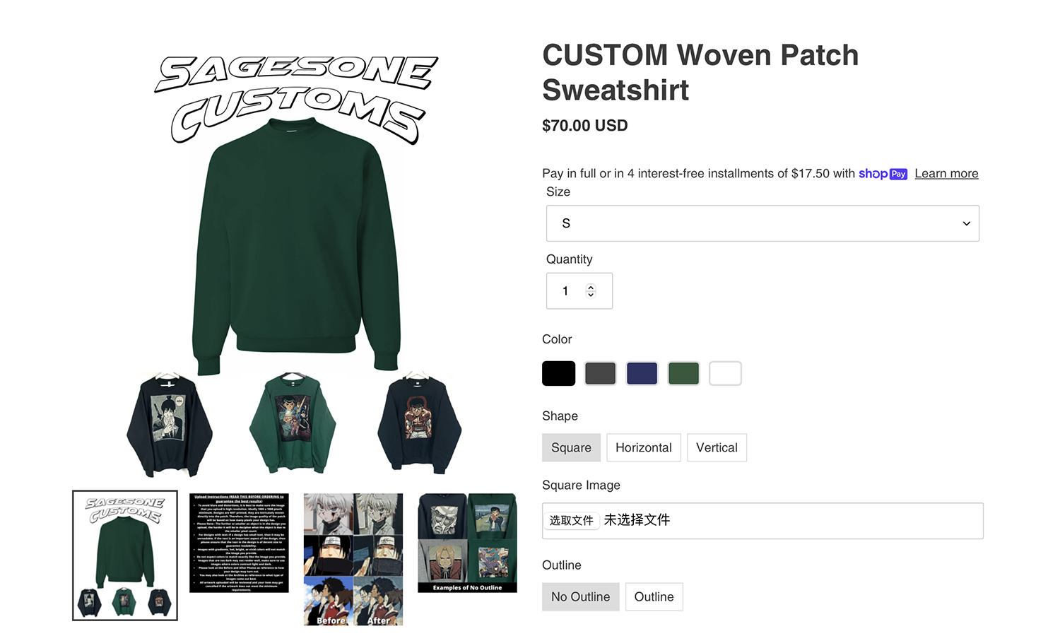 如果你打开 SAGESONE 的官方网站,会发现除了他们正在售卖的设计之外,还提供了个人定制的选项。你可以选择帽衫、卫衣、T-Shirt 等不同款式、颜色的底版,再选择一张自己喜欢的图片并上传,接下来他们会按照图片制作出一块挂毯材质的物料,然后按照既定的位置帮你缝制或拼接在衣服上,大多是以补丁和拼贴的形式。