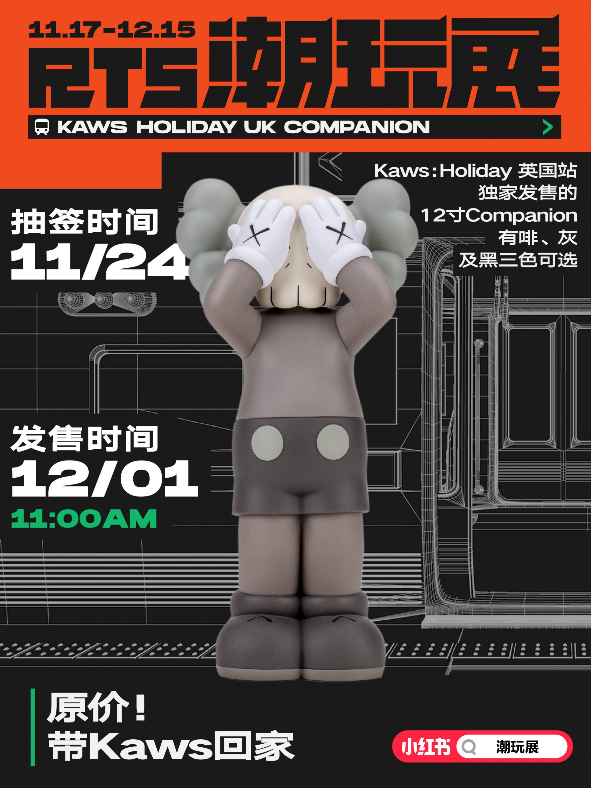 《KAWS: HOLIDAY UK》(英国站)12 寸 Companion 公仔。三款配色:咖啡色(原色)、灰色、黑色均可以抽签。