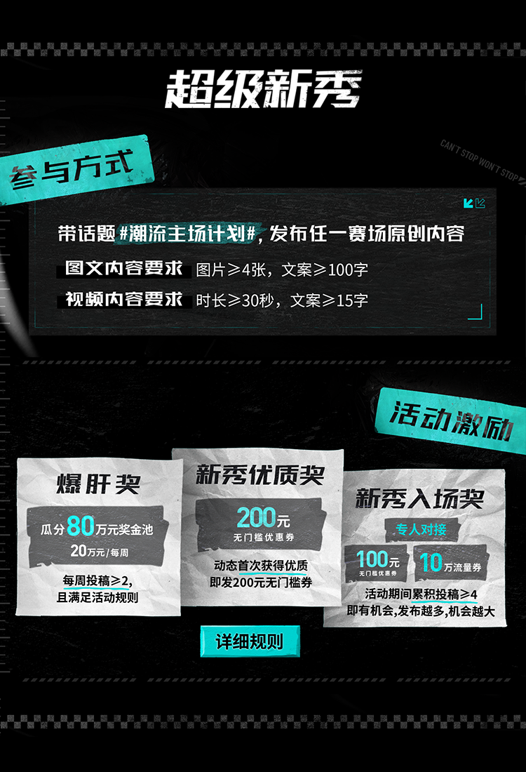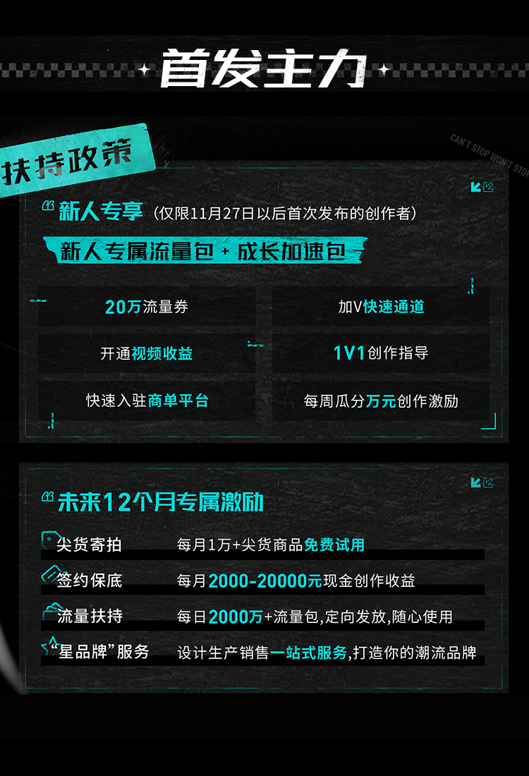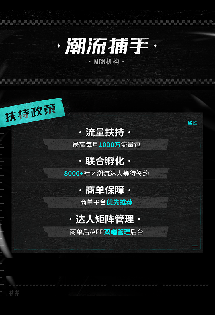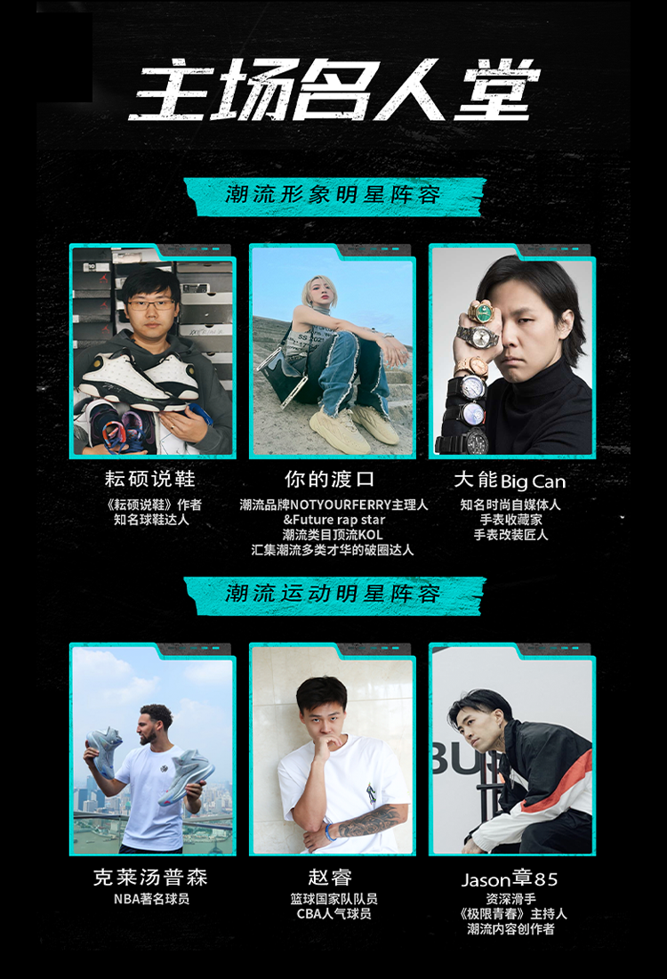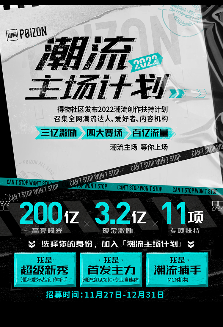 本次 POIZON ALL-STAR DAY(得物全明星日)更为人所关注的是得物发布的「潮流主场计划」,其中为优质创作者们提供每月超过 1 万件的免费尖货体验库和每周超过 8000 万的流量推广,还开放了得物商业合作服务平台「引力平台」,让粉丝数 100 的创作者们也能商业变现。