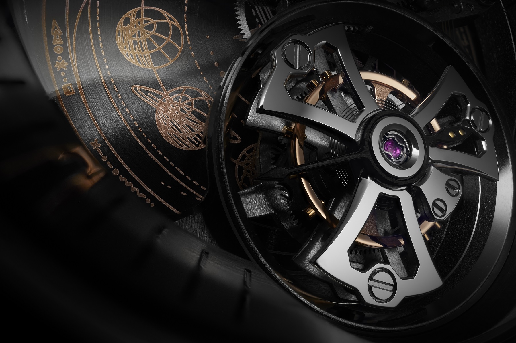 而「蜘蛛」,这个对 Dr. Woo 而言象征着力量和保护的元素在八枚限量版时计上移动着,出现在每一个表盘上的不同位置,因而使得每一枚腕表都成为绝无仅有的独创作品。此外,只有佩戴者才能享受的细节还包括了表背上的宇宙图,为这款非凡时计和表主之间建立起更深层次的联系。