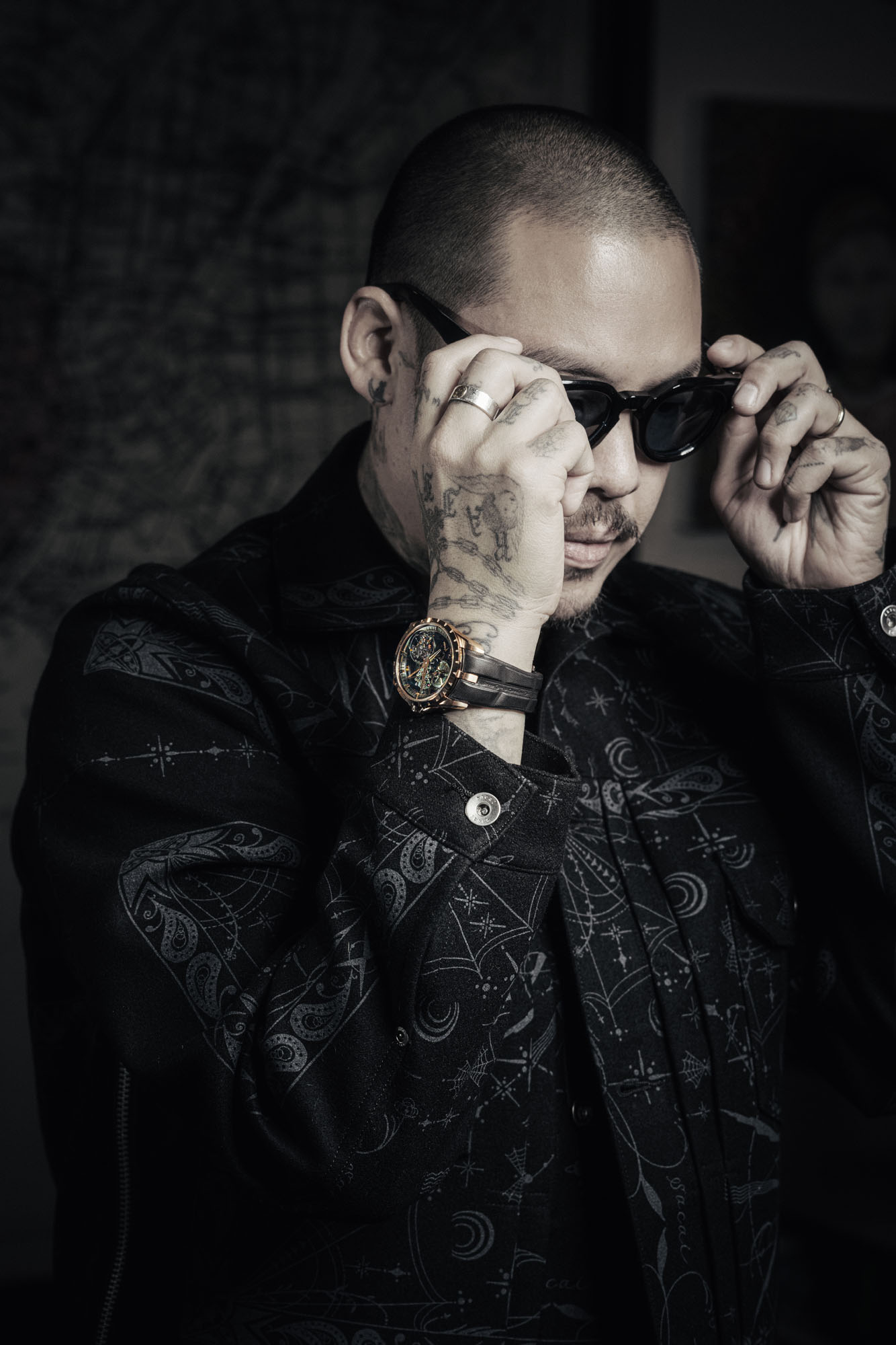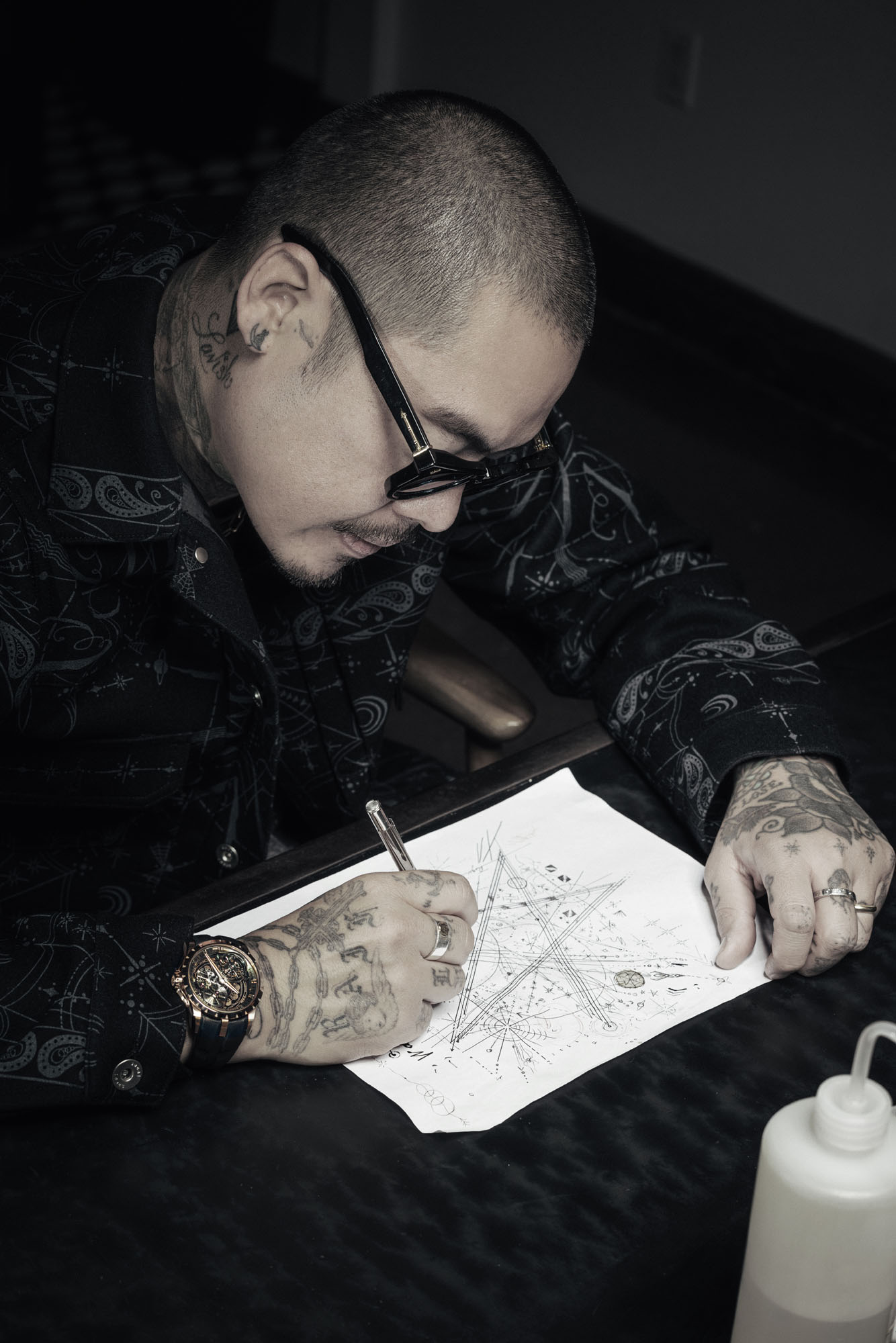 当然,艺术与品牌的跨界合作并不局限于时尚领域,近期我们就看到了这样的作品,罗杰杜彼 Roger Dubuis 王者系列艺术家合作腕表中的 Dr.Woo 设计款。相信熟悉潮流圈的各位应该都听说过 Dr. Woo 的名字,他是加州传奇纹身店 (The Shamrock Social Club) 最难预约的纹身师,包括 Drake、Johnny Depp、G-Dragon、陈冠希这些名流都是他皮上艺术的完成者。