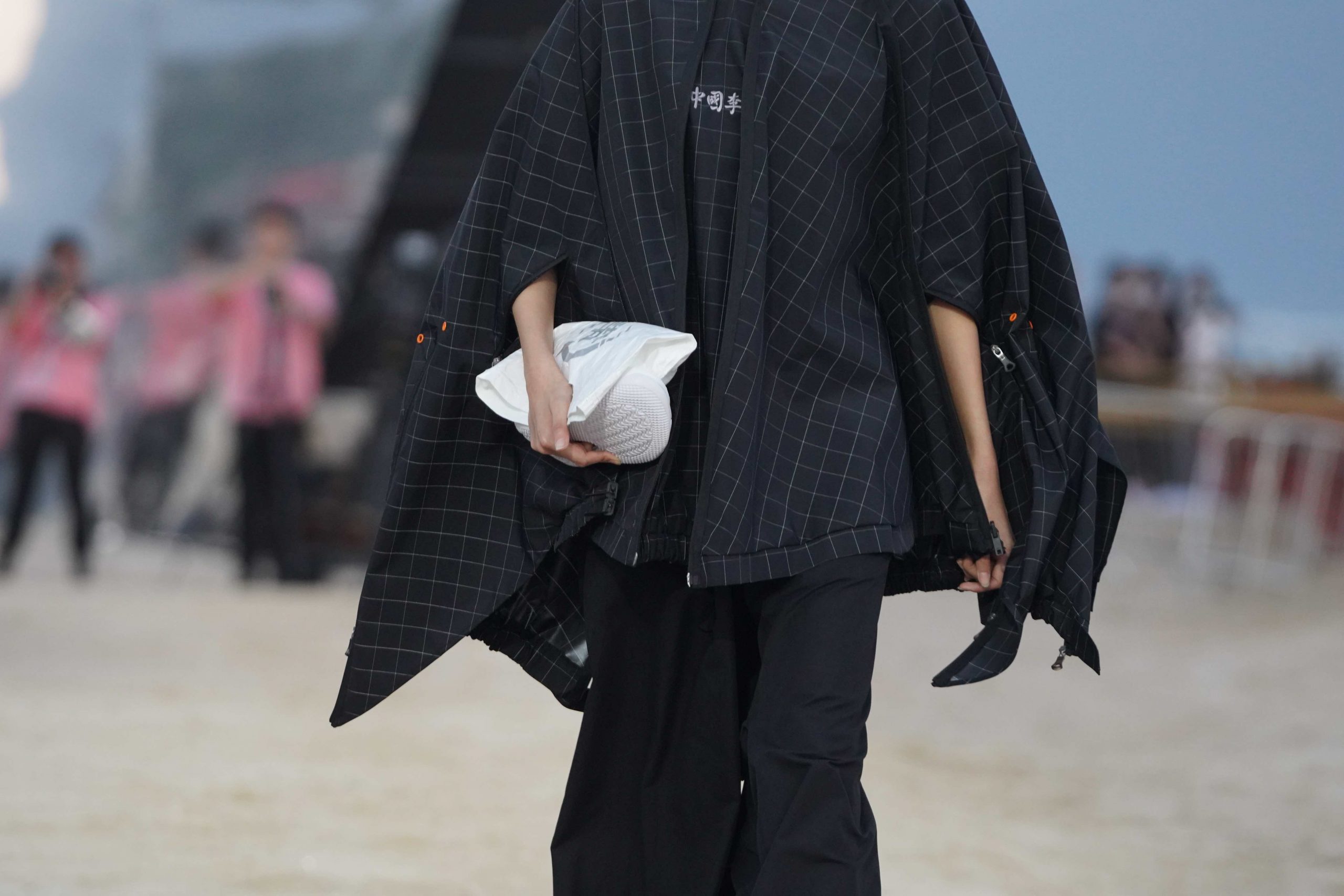 与此同时,折纸的「峰」与「谷」所形成独特几何美学,出现在秀场的一些夸张帽型和隐藏设计之中,更与苗族传统图腾图案形成天然的共鸣。除了服饰廓形、图案上的启发,配饰部分也带来了更多大胆尝试,以「世界上最后一只雄性白犀牛苏丹」为造型的折纸犀牛包,「心有灵犀」地表达出人与自然和谐共生的理念,亦是刘通的折纸艺术首次以配件方式呈现。