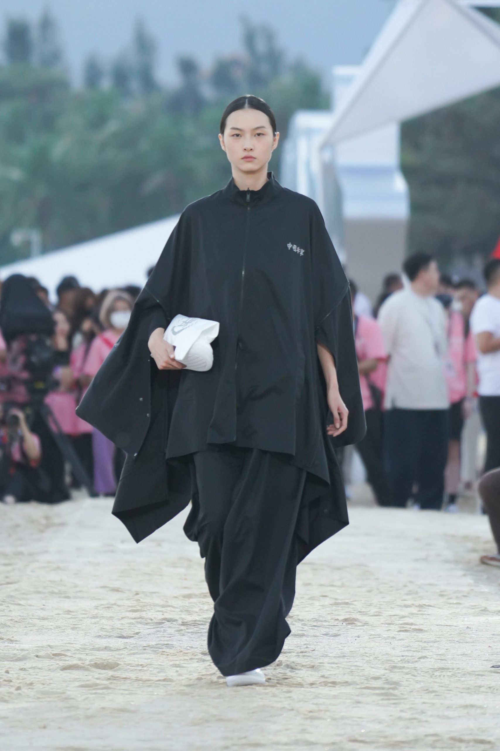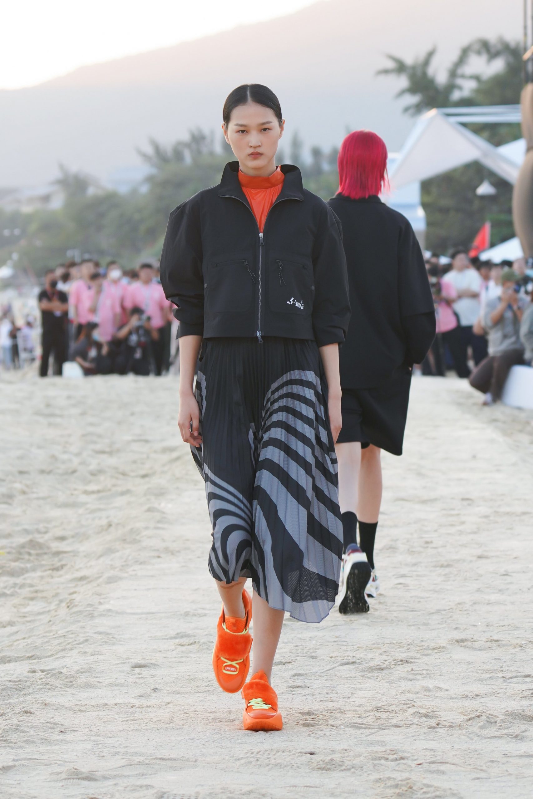 以音乐节为主题,所以这场潮流发布的秀场音乐就邀请了李宁签约音乐艺人朱婧汐、唱作音乐人满舒克、知名摇滚乐队大波浪乐队共同完成。随着大波浪现场 LIVE 音乐响起,身着中国李宁 22 春夏系列服饰的模特在黄昏落日下的沙滩上聚光而来,在现场打造了一个青年文化的沉浸式理想国,李宁女子运动风尚大使钟楚曦的亮相再次掀起活动高潮。