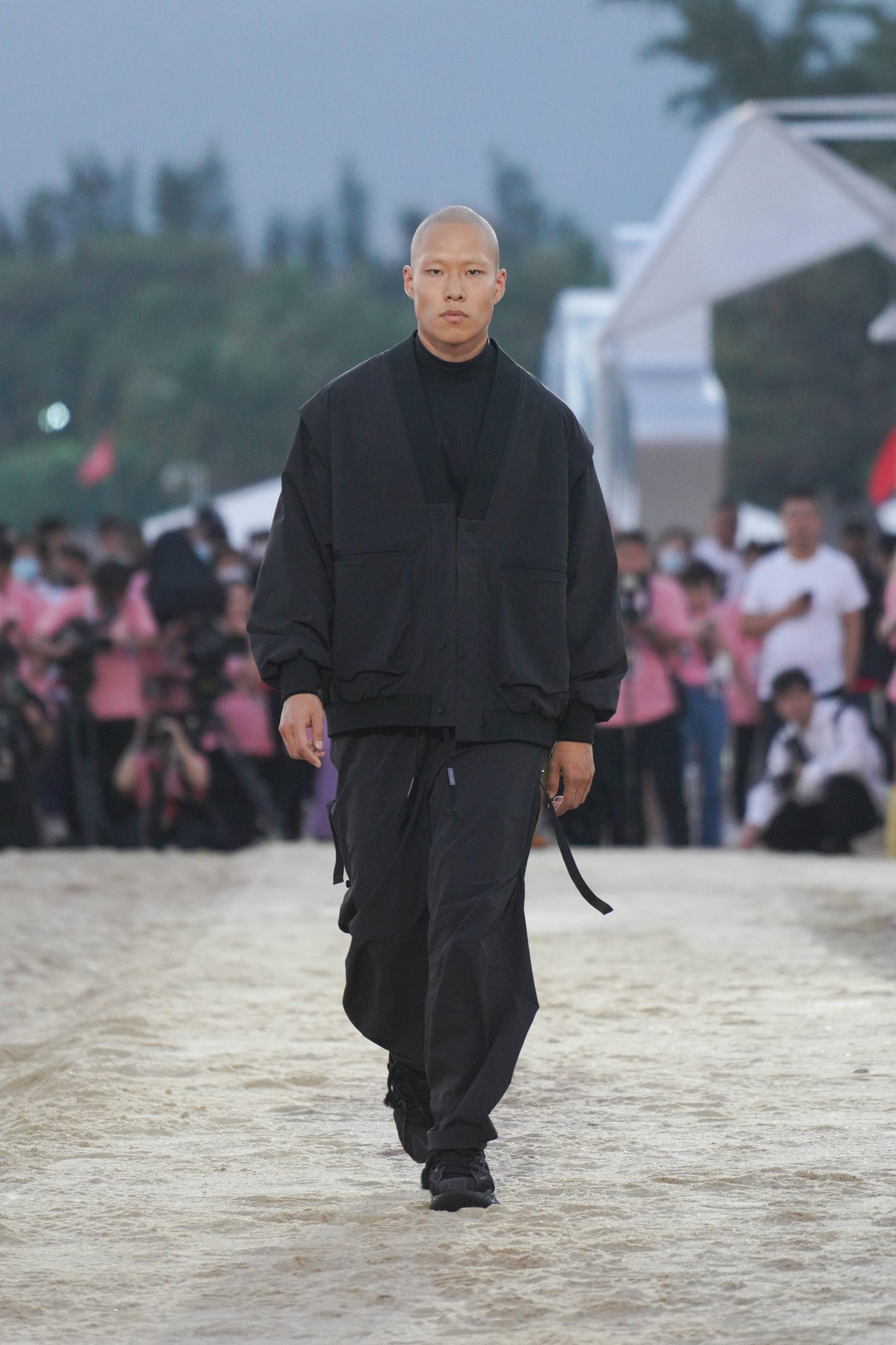 而为了让服装更有潮流属性感和年轻感,设计师还将一些类似于机车的元素、激流的水流纹路,还有一些运动相关的内容与日常服饰进行了结合,并发现了一些随机感的形态,于是就保留了下来,成为秀场上许多款式的灵感来源。借助科技面料的运用,设计师还在一些小的细节上例如登山绳、服装上的网布,防水气囊和马甲都将运动元素和潮流属性结合再来一起,让实用性与潮流紧密结合,带来风格鲜明的呈现。