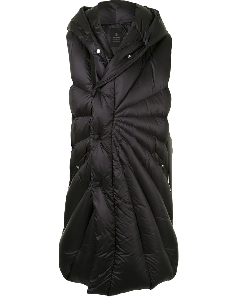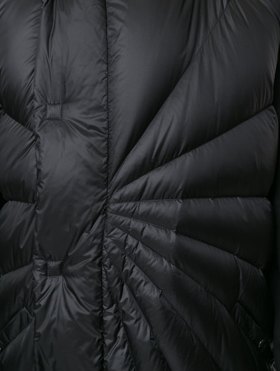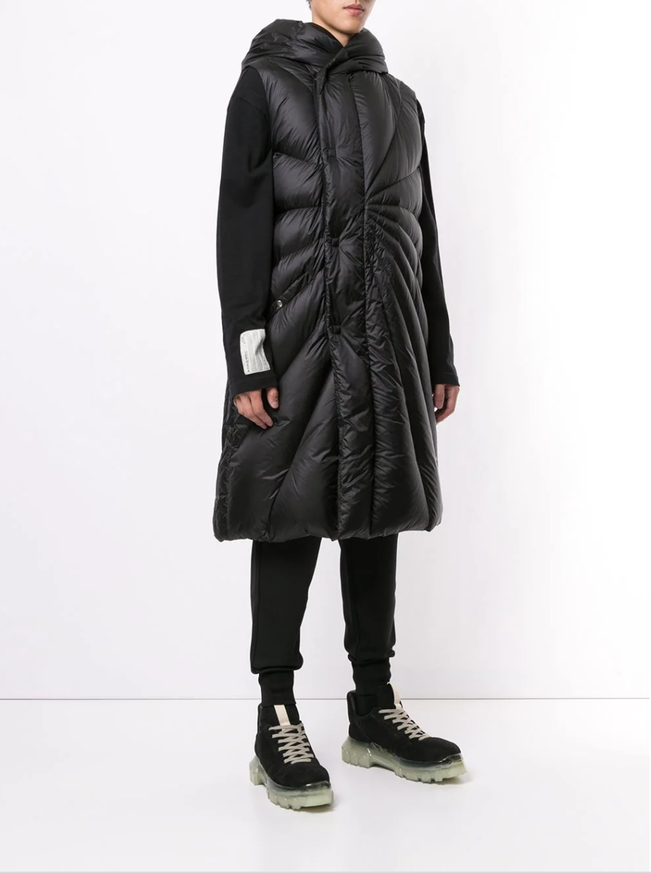 两者合作的这款黑色羽绒马甲,同样展现了 Rick Owens 的雕塑感审美。中长款的设定提升了时尚效果,最特别的细节在于数个向外延伸的压线设计,让服装形成立体感的肌理,打造了丰富的视觉层次,另外连帽设计保证了一定的功能性。虽然驾驭难度有点高,熟悉的受众一看就知道它出自 Rick Owens 的手笔。
