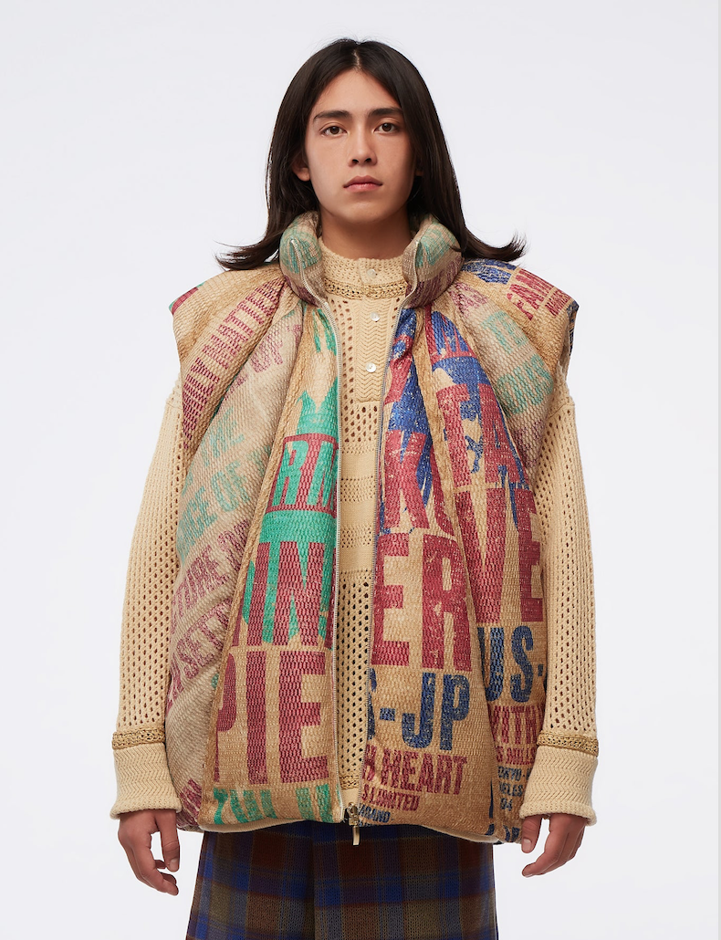 NAMESAKE 在制衣工艺上非常讲究,运用泥染、手工制作、刺绣等技法彰显单品的设计美感。这款米色字母马甲,一眼就能看出采用了当下大热的仿旧制法,上面的字母也一并采用脱落和褪色处理,有种旧年代海报的即视感。不仅如此,从衣领延伸到下方的线条将衣身切割成无数个几何块状,增添了视觉的饱满度。