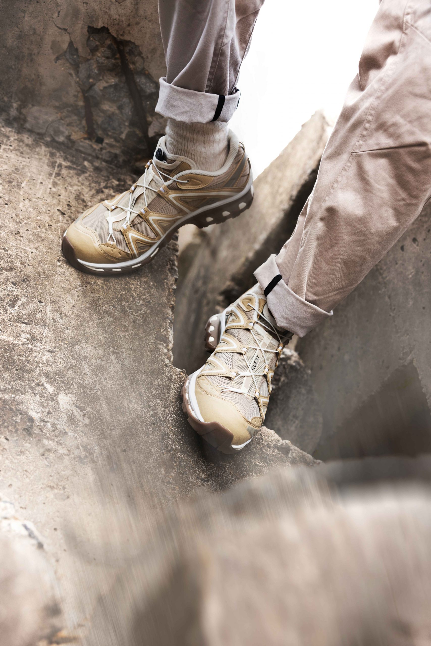 受 2015 年合作时推出的 SNOWCROSS 启发,深谙 SALOMON 鞋底科技 Chassis 的 TBA 主理人 Guillaume 和 Romain,与 SALOMON 共同挖掘品牌的档案库。基于此前双方合作中对于 WINGS 系列积累的浓厚兴趣,今次将初代 XT-WINGS 的鞋面实验性地嫁接至 QUEST 4D GTX 鞋底上,打造出视觉与性能兼具的全新配色混合鞋款 —— XT-QUEST。