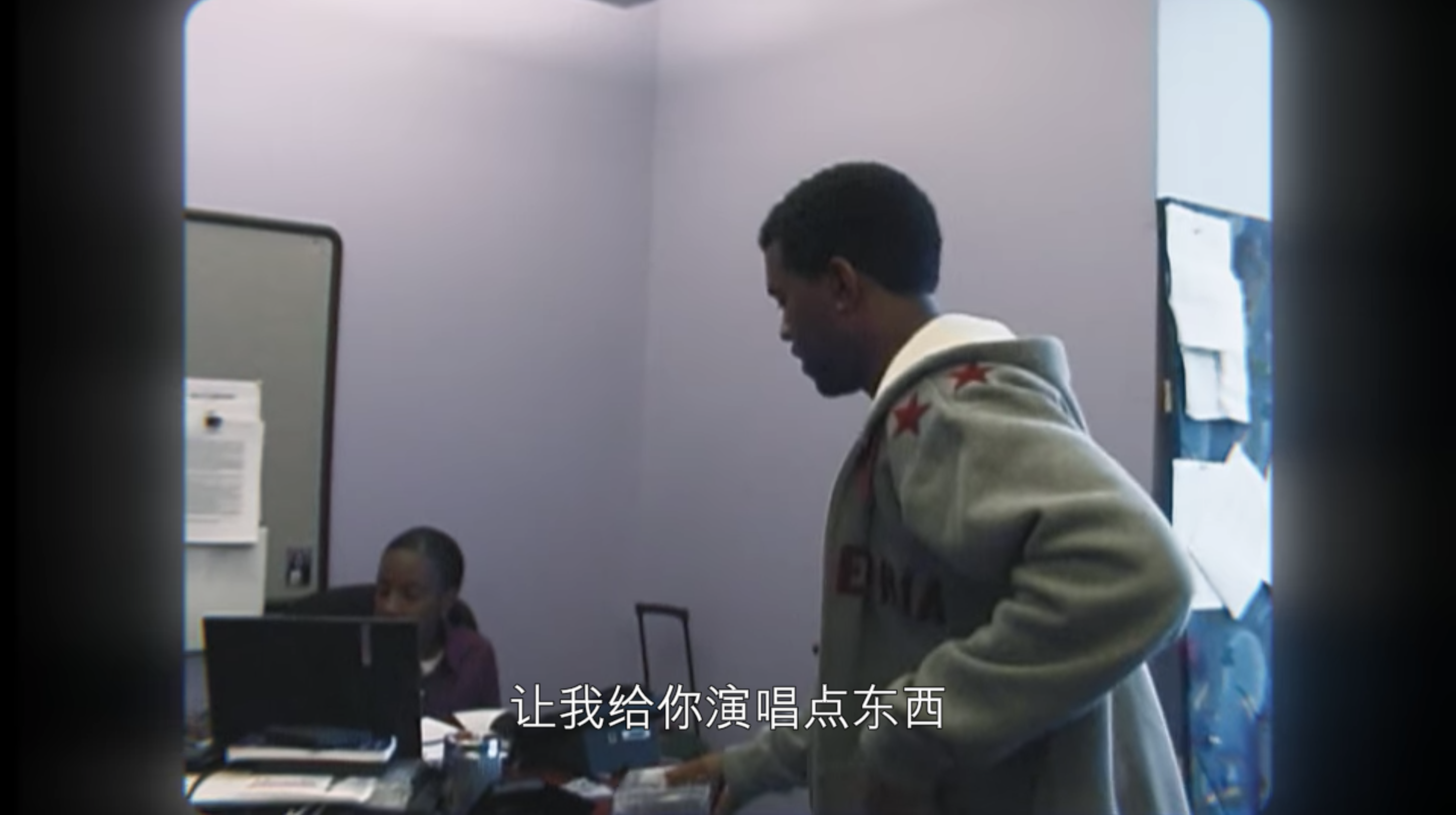 他主动走进市场营销、总经理助理等人的办公室,播放 demo 的同时投入演唱,可是对方却仍旧无动于衷,继续和别人打着电话,聊着和音乐无关的事情。被无视的 Kanye 只能尴尬地微笑离开,透过屏幕都能感受到他的失落。