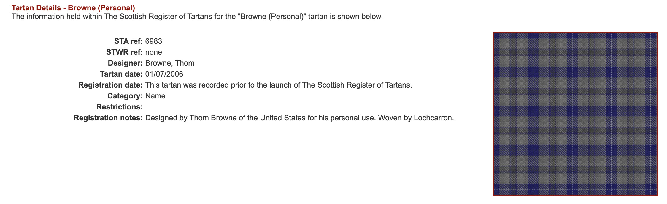 这种格子呢在「The Scottish Register of Tartans」网站中以 6983 代码被登记为品牌专属,由 Thom Browne 设计,仅供品牌使用,并由 Lochcarron 织造。后者历史可追溯到 18 世纪,一直为 Vivienne Westwood、COMME des GARÇONS 等时尚品牌提供最好的苏格兰纺织品。