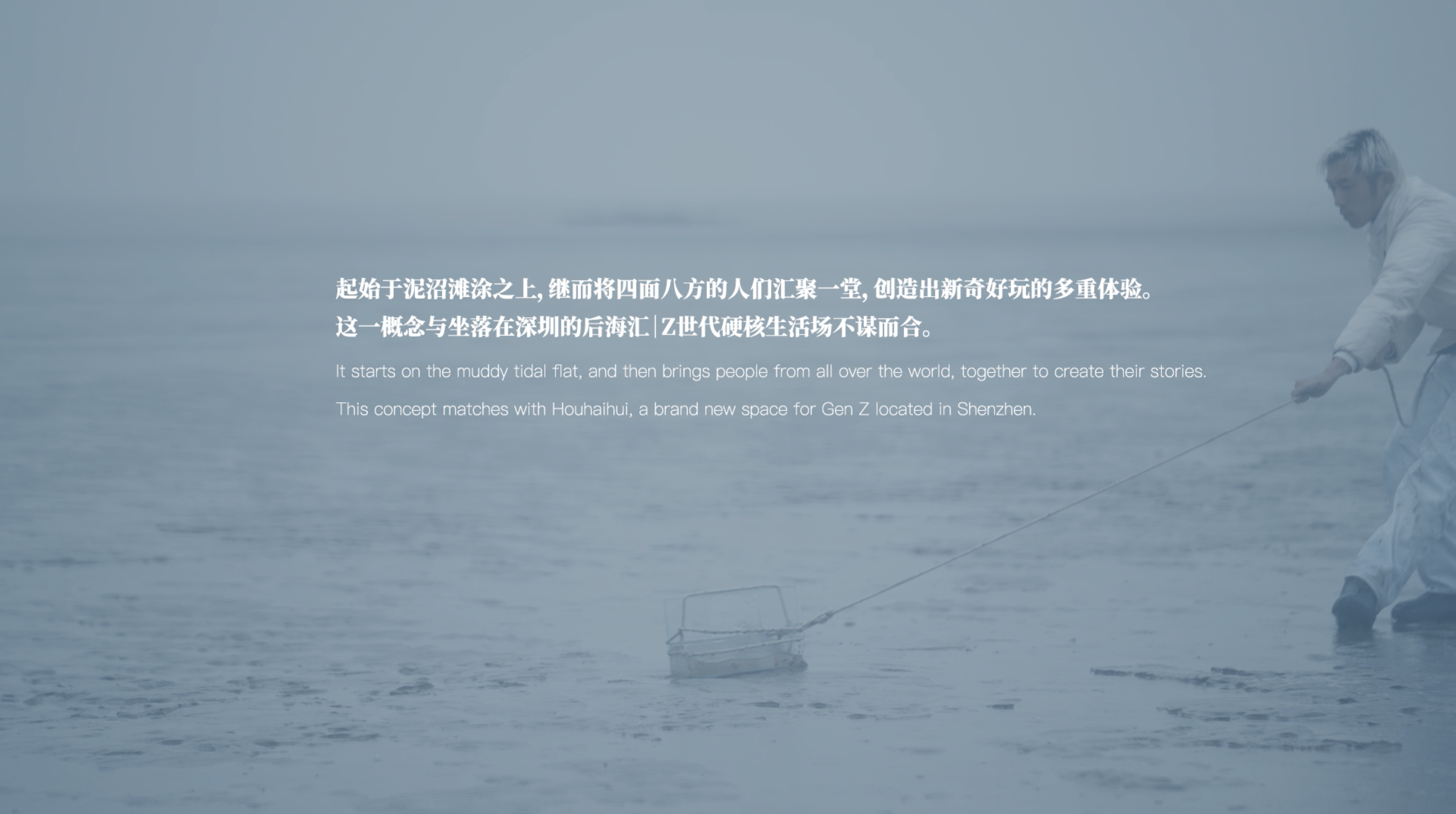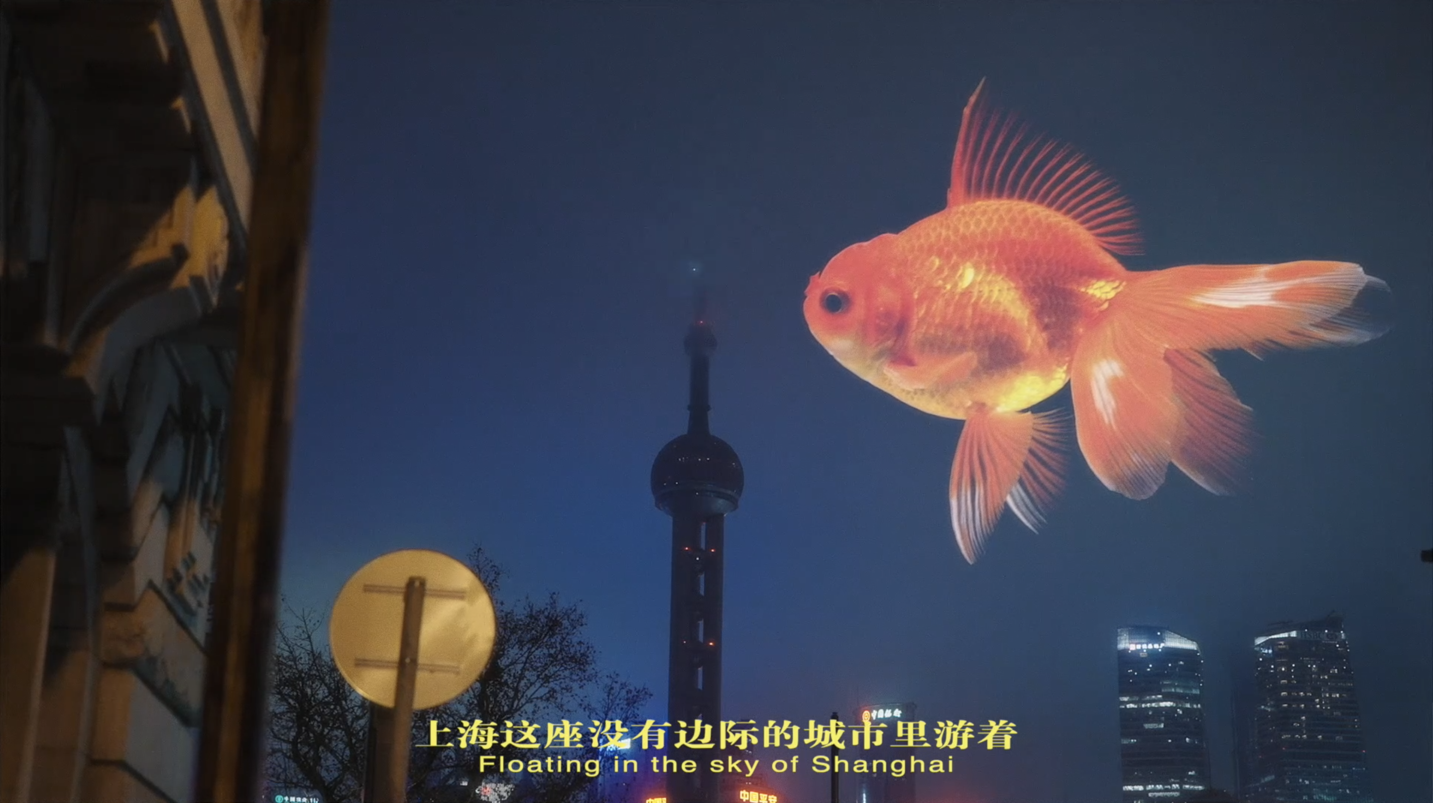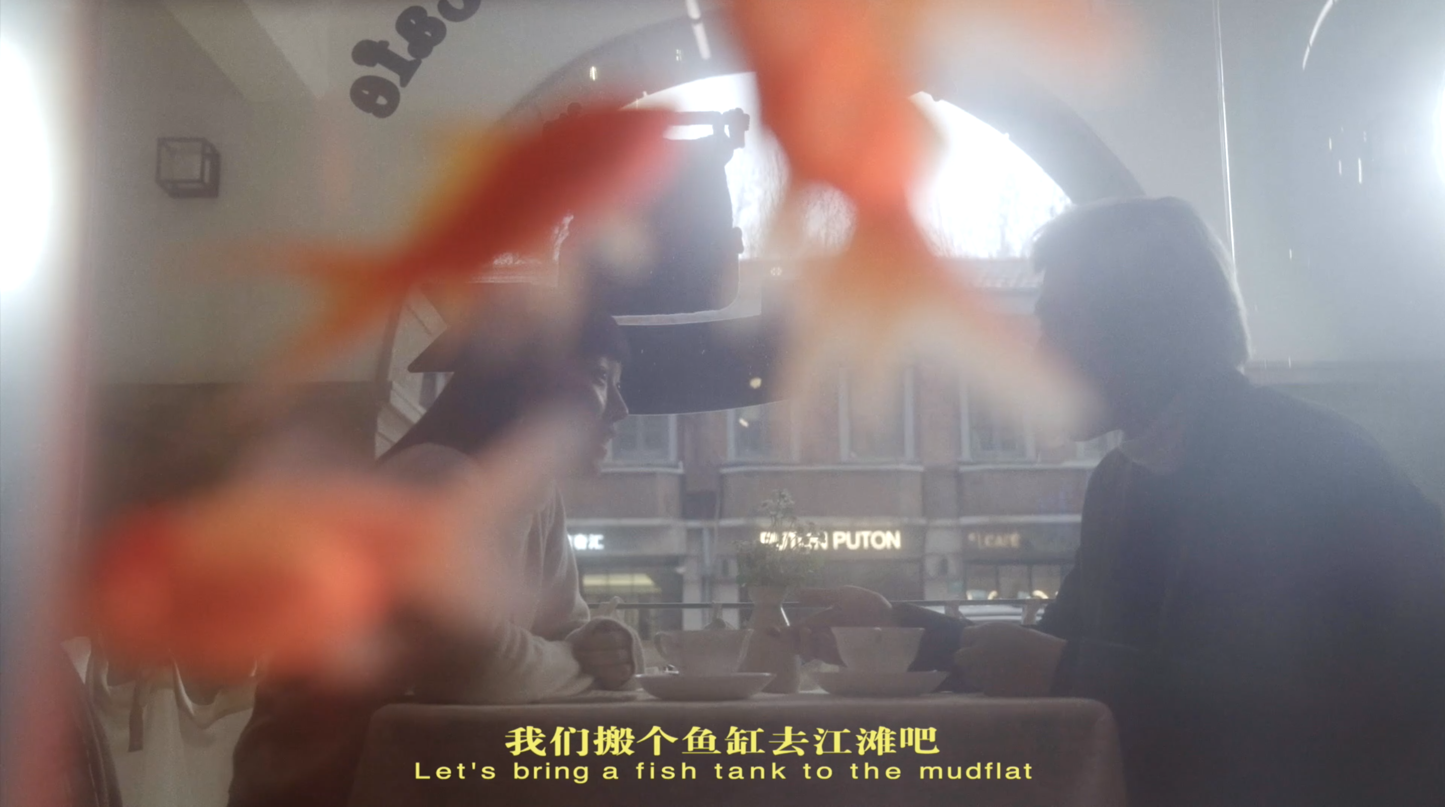 在对谈中,邵琪仿佛灵光乍现,「我们搬个鱼缸去江滩吧」。画面中,姚念宇系上绳子拉着装满鱼和水的「鱼缸」,行走在滩涂中,他们所想表达的观点,通过画面、装置、语言在表述和传递,「鱼缸作为一个容器,有着包容和汇聚的特质。它喻指着承载汇聚年轻活力的新空间,就像是让我们自由表达的上海,以及汇聚了五湖四海创意想法的后海汇一样,他们包容的汇聚了一切新鲜好玩的事物」。