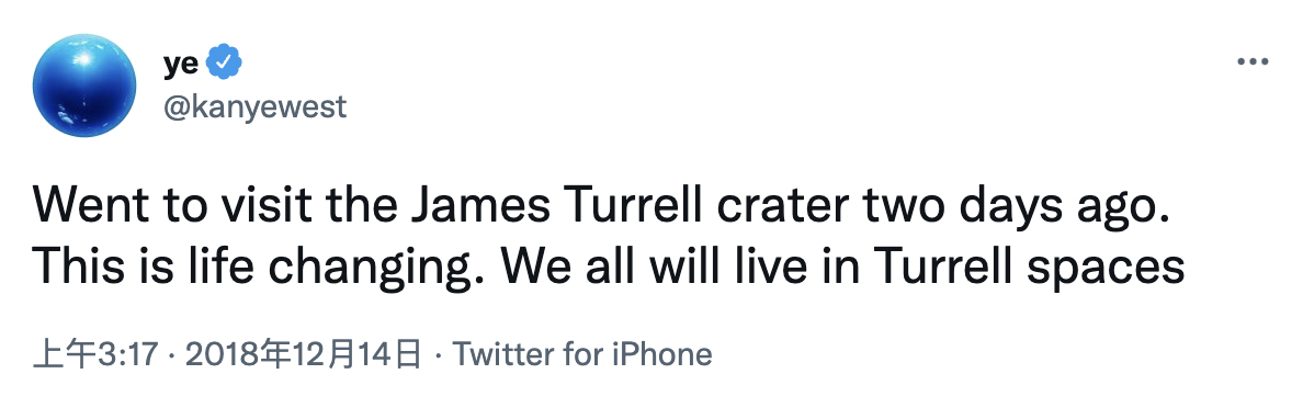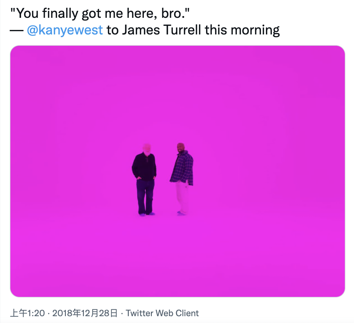 值得一提的是,无论是 Ye 的音乐,还是 Turrell 的大地或装置艺术,他们都希望通过不同的媒介将精神体验向下渗透,拉近与观众的距离。至于开篇所说的 Sonesta 酒店的资讯,究竟是 Ye 真的参与其中,还是 Ye 单纯想在社软上支持或再度赞赏这位老友的才华,我们不妨拭目吧。