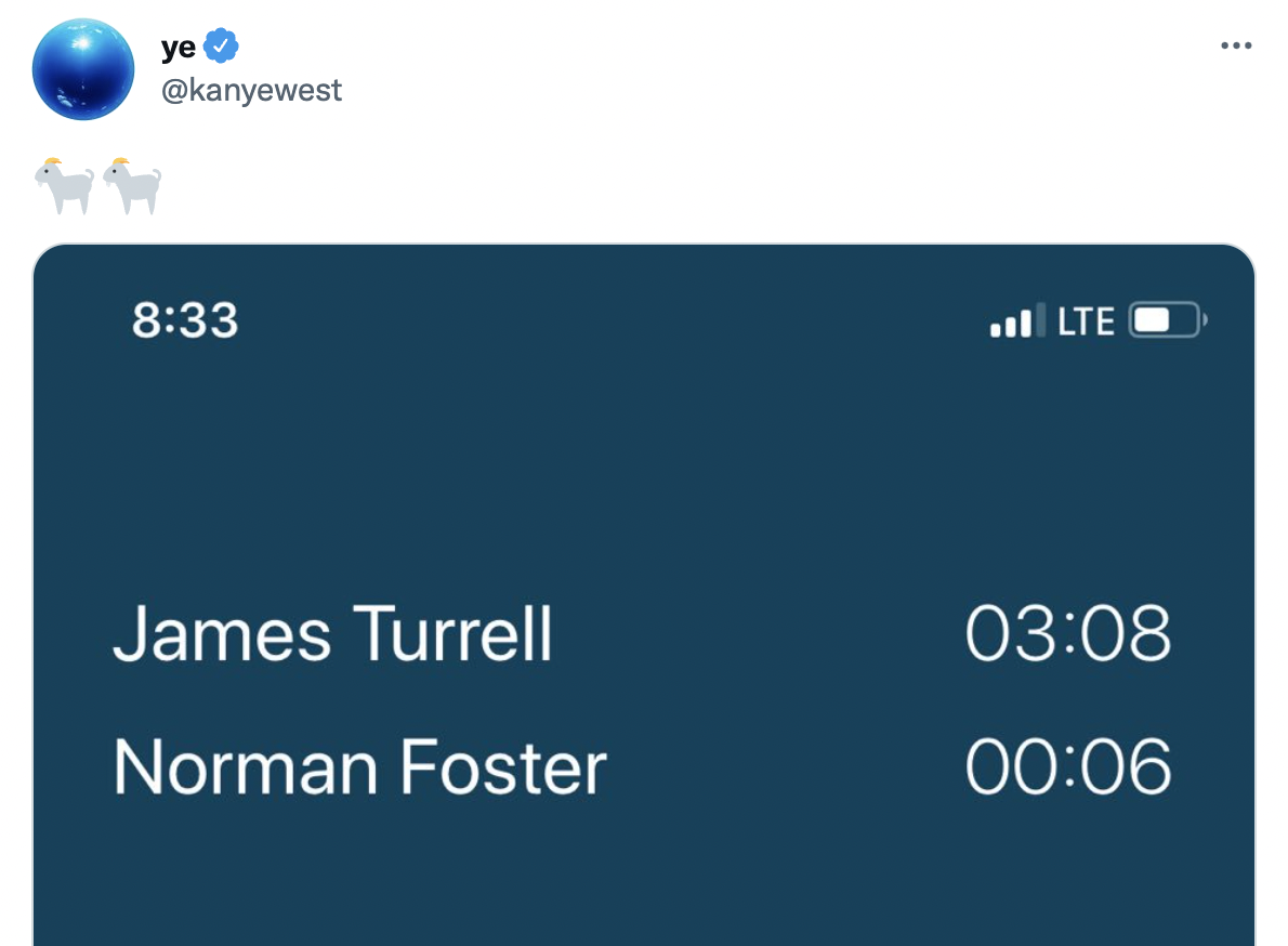 2018 年— 19 年是 Ye 和 Turrell 接触最密切的一段时间,从 Ye 参加 Turrell 的 MASS MoCA 展览「Into the Light」,后来两人还在此空间的二楼进行长时间的交谈,到 Ye 在推特上晒出自己与 Turrell 和建筑师 Norman Foster 的通话记录;而 Turrell 通过邀请 Ye 参观罗丹火山口(这个项目至今未公开)来回馈他的欣赏之情,自此之后,Ye 开始构思新的建筑方案以及对视觉效果的呈现方式。
