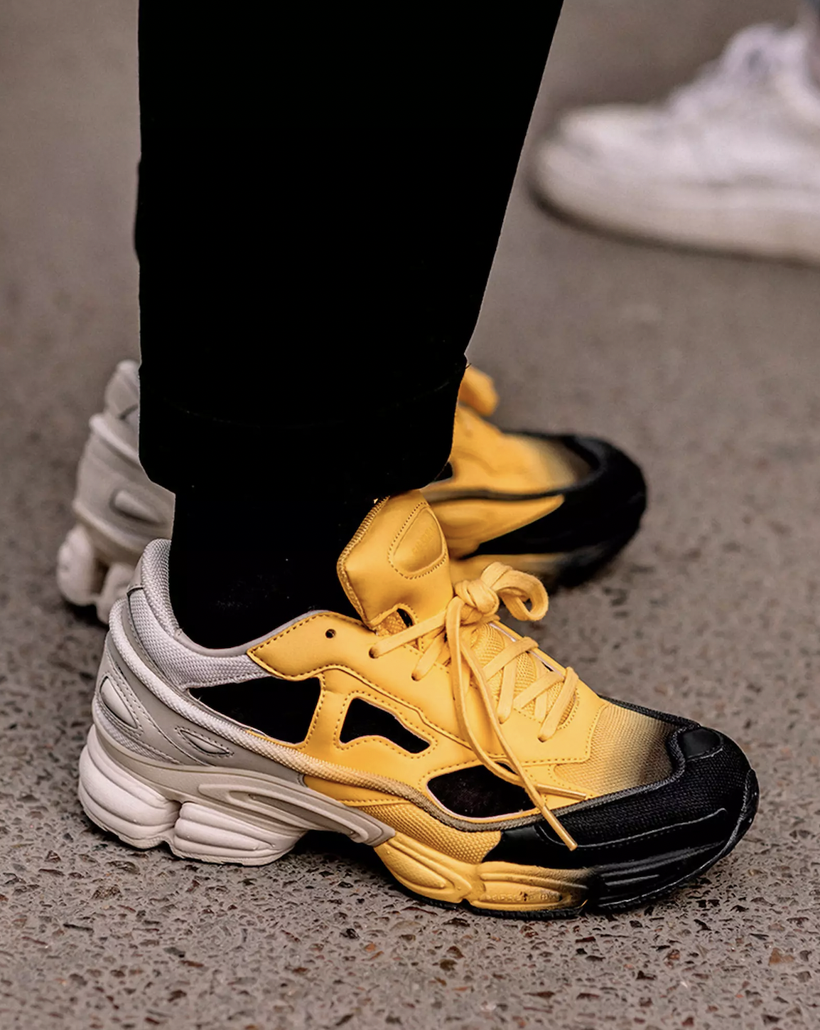 到了 2013 年,Ozweego 和 Raf Simons 的合作更是助推了其在时尚和潮流领域版图的扩张。厚重的鞋底和多层鞋面的设计一经推出,迅速吸引不少关注。作为当时市面上观感最为笨重的鞋型,Raf Simons 的 Ozweego 常被认为是凭一己之力改变了运动鞋的设计发展方向,成为老爹鞋潮流的「始作俑者」,在后来的不论是 Balenciaga 的 Triple S,或是 Yeezy 700 的身上都可以看到它的影子。