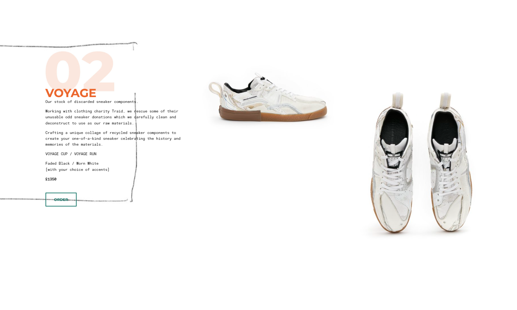 而 VOYAGE 模式则是相对便宜的选择,两者的区别在于,鞋款制作的原材料不需要你来提供,Helen Kirkum 团队会从他们的废弃球鞋库存以及服装慈善机构 Traid 提供的旧鞋中获取,你可以选择 VOYAGE CUP 与 VOYAGE RUN 两种分别偏向于休闲与运动的不同风格进行制作,虽然没有 LEGACY 那样能够完全体现个人属性,但最终设计也同样是独一无二的。