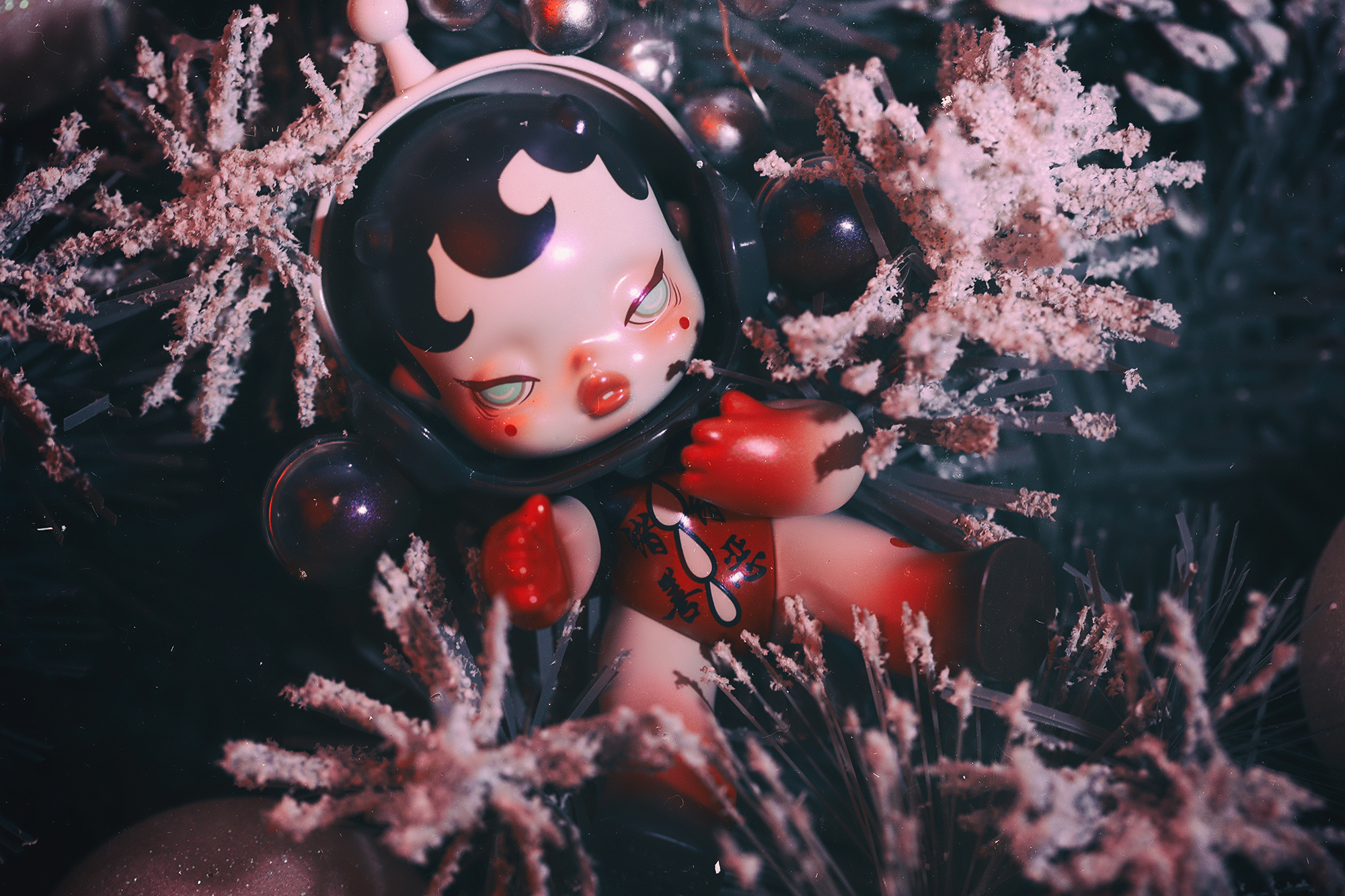 作为 SKULLPANDA 的首款 MEGA 珍藏系列,熊喵在作品中一直表达的「分裂」和「平衡」得到延续,球形辫子除了是像星球一样略带俏皮的特征之外,它和头盔一起所呈现的三角形构成,代表了创作者熊喵所追求的某种平衡。