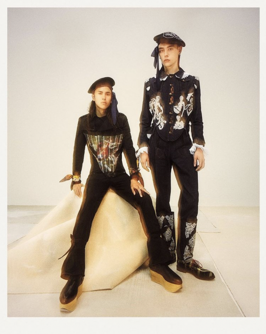 随后在 Central Saint Martins 中央圣马丁学院和 Levi’sⓇ By Levi’sⓇ 的合作中,Juntae Kim 用古典波浪纹路对下摆进行再设计,通过将男装与胸衣廓形结合,改变了牛仔外套本身的硬朗,为其赋予独特的巴洛克美学。