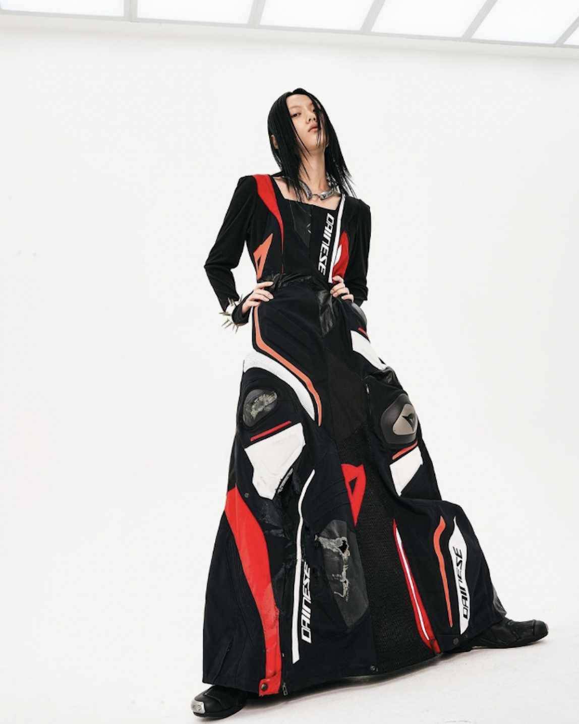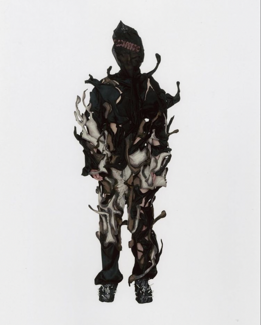 同样是天马行空的表达,KUSIKOHC 采用了更为锋利的视觉设计。在以红、黑、白为主色调的 2022 春夏系列中,设计师 Cho Gi-seok 利用大胆的不规则立体碎片,呈现大火焚烧后的缺憾美。值得注意的是,除了街头风的棒球夹克、机车裤、背心之外,这一系列还选取了更为「正统」的西装外套和领带衬衫,实验性定义了街头和正规的边界。