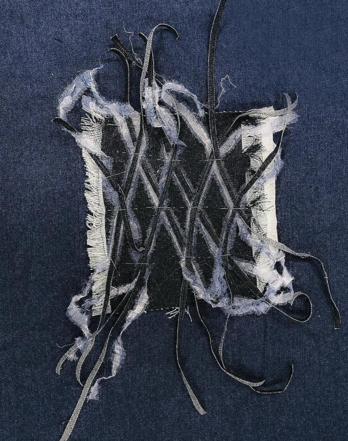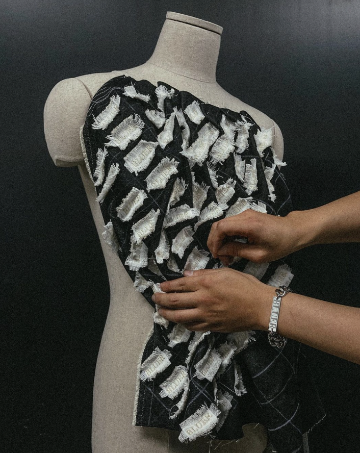 BLUER 在我们常见的丹宁设计中,通过全程手工开创布料、染色、编织工艺,解构再造,改变了面料原先的硬挺状态,为传统的,或者说大众眼中已稍显乏味的丹宁,增添了更多艺术性。