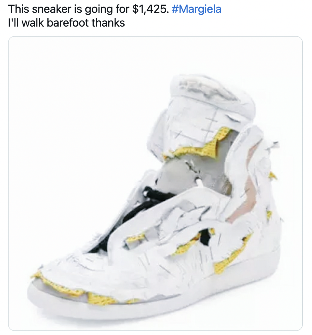 时至今日,在创意总监 John Galliano 沿袭下,类似这样的审美依然存在于 Maison Margiela 设计当中。该品牌曾在 2017 年推出一双充满解构意味的运动鞋——内层材料外显,如被动物撕咬、虫蛀过后的鞋款在网友看来似乎有些极端,「这款运动鞋售价 1,425 美元。对于这种鞋子,我宁愿赤脚走路。」、「这是最新的时尚??」等调侃言论充斥在网络上。