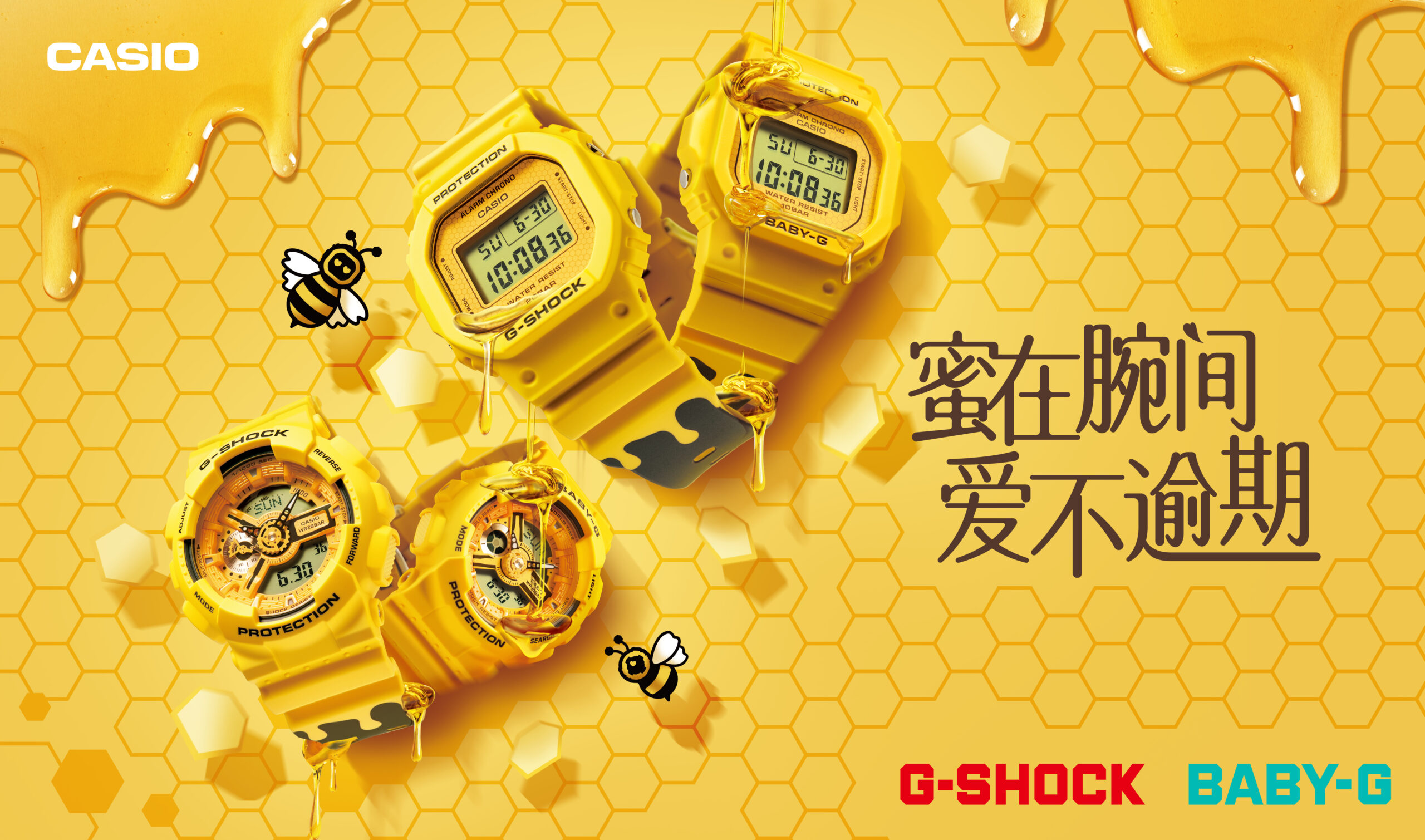 蜜蜂作为大自然的搬运工,不止产出香甜的蜂蜜,在采蜜过程中散播的花粉,也使其成为大自然的搬运工与植物间爱的传播者。而蜂蜜香甜可口又浓郁的味觉感受,以及不易变质的特性,也化作一段完美感情的象征。G-SHOCK 表款一向具备潮流搭配潜力与坚实耐用的属性,加之从这种意象中汲取的灵感,使得「HONEY」系列既在外形上引人注目,又在设计理念上充满美好的祝愿。
