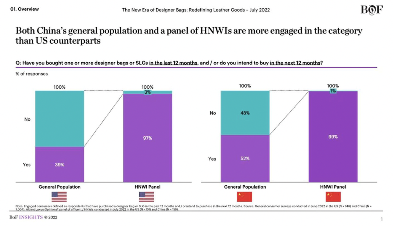 中美两国购买名牌包款的比例(HMWI 为高净值人群) | Via BOF
