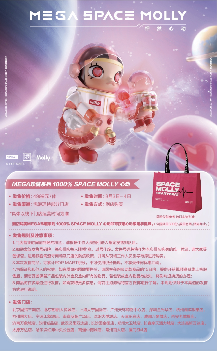 泡泡玛特 MEGA 珍藏系列 SPACE MOLLY 心动第二波,将在 8 月 3-4 日以七夕「心动瞬间」特别活动的形式发售 MEGA 珍藏系列 1000% SPACE MOLLY 心动,到店购买,价格为 4999 元/体,并限定每人限购一体。