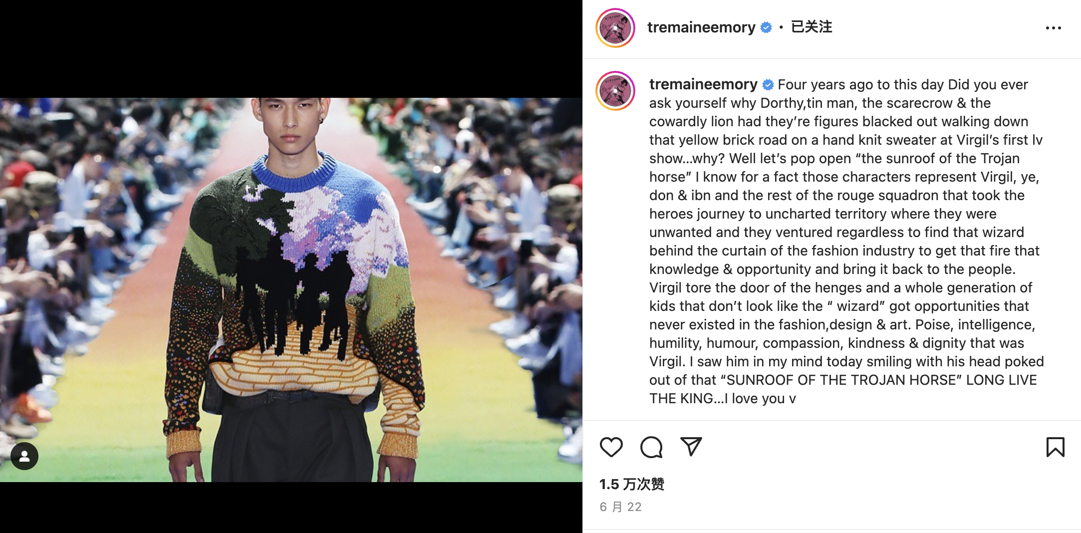 LV SS23 举行秀场时间,Emory 发布 IG 称「Virgil 打开了特洛伊木马的天窗」| Via Instagram @tremaineemory