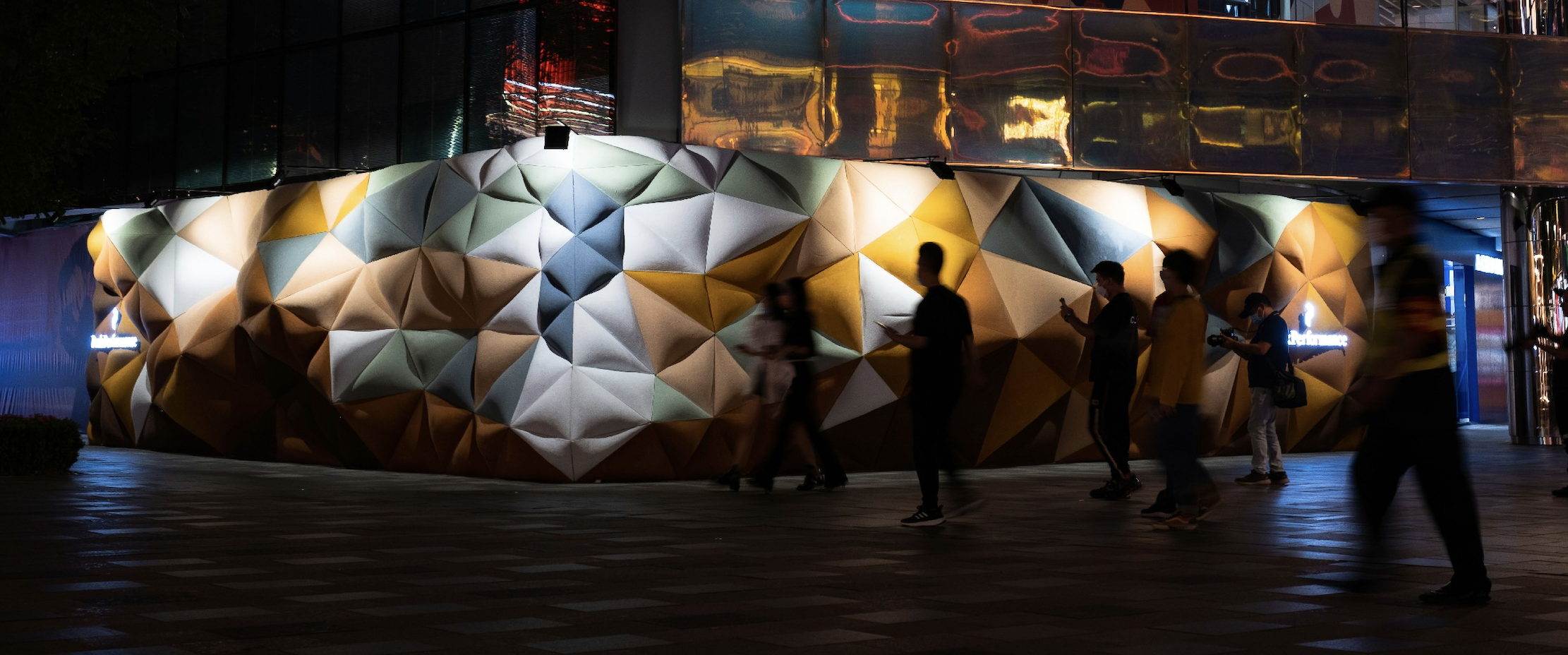 围挡艺术装置的视觉溯源,取自瑞典最高峰的凯布讷山。王子耕提取了 PeakPerformance 品牌重要的山系基因,将山峰的形态抽象化演绎,并将《无题(褶皱III)》中平面的三角形元素,转化了立体的三角拼贴,在都市空间内,凸显出了「山」的形态。而在围挡装置的表面,手工涂刷的亚麻布材料,可以使人们联想到温暖,联想到冬季,以及 PeakPerformance 设计的服装为户外运动提供保护的感觉,并在此基础上加入了羽绒服的外形参考以及绗缝线条的元素,将原本锐利的三角变的柔软有曲面,使其与城市建筑中常规的直线条和硬质材料形成差异,形成了矛盾性的张力,也进而赋予了围挡艺术装置独有的折痕美感。