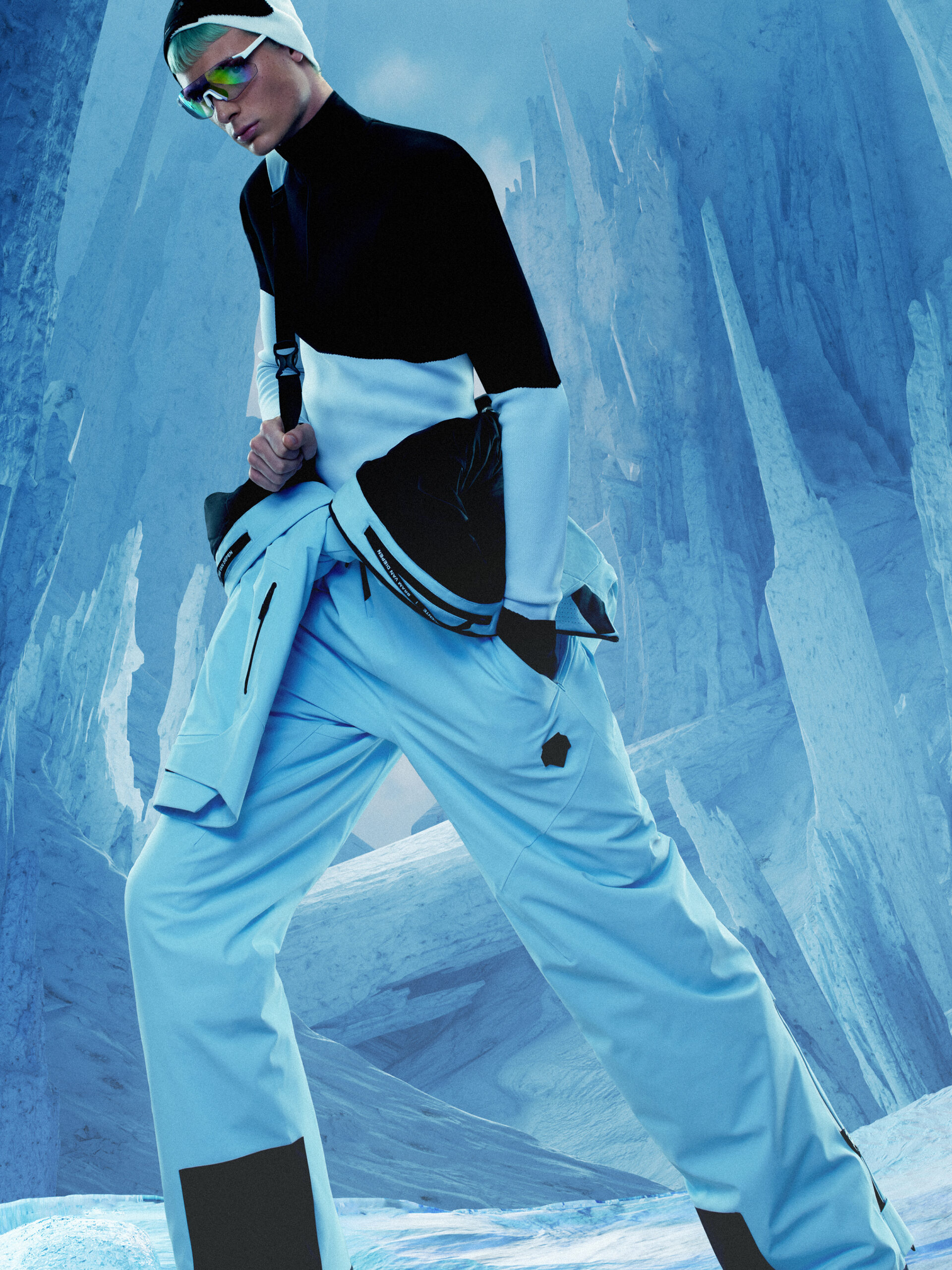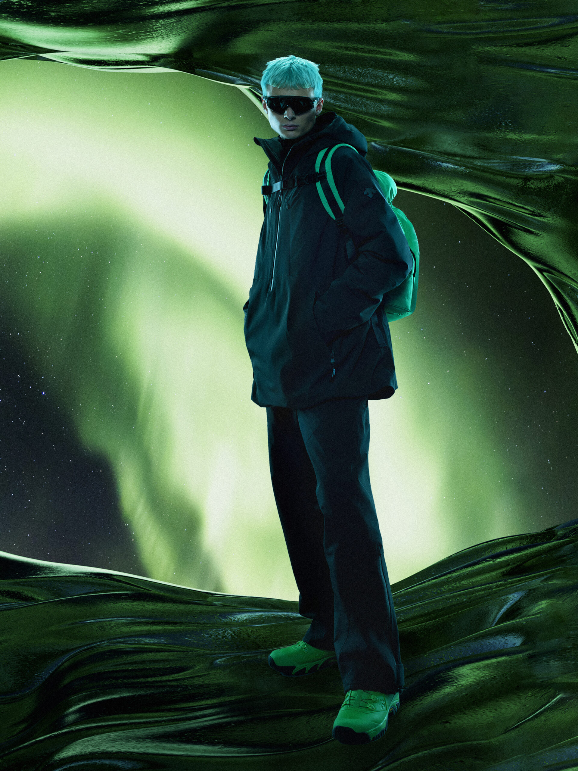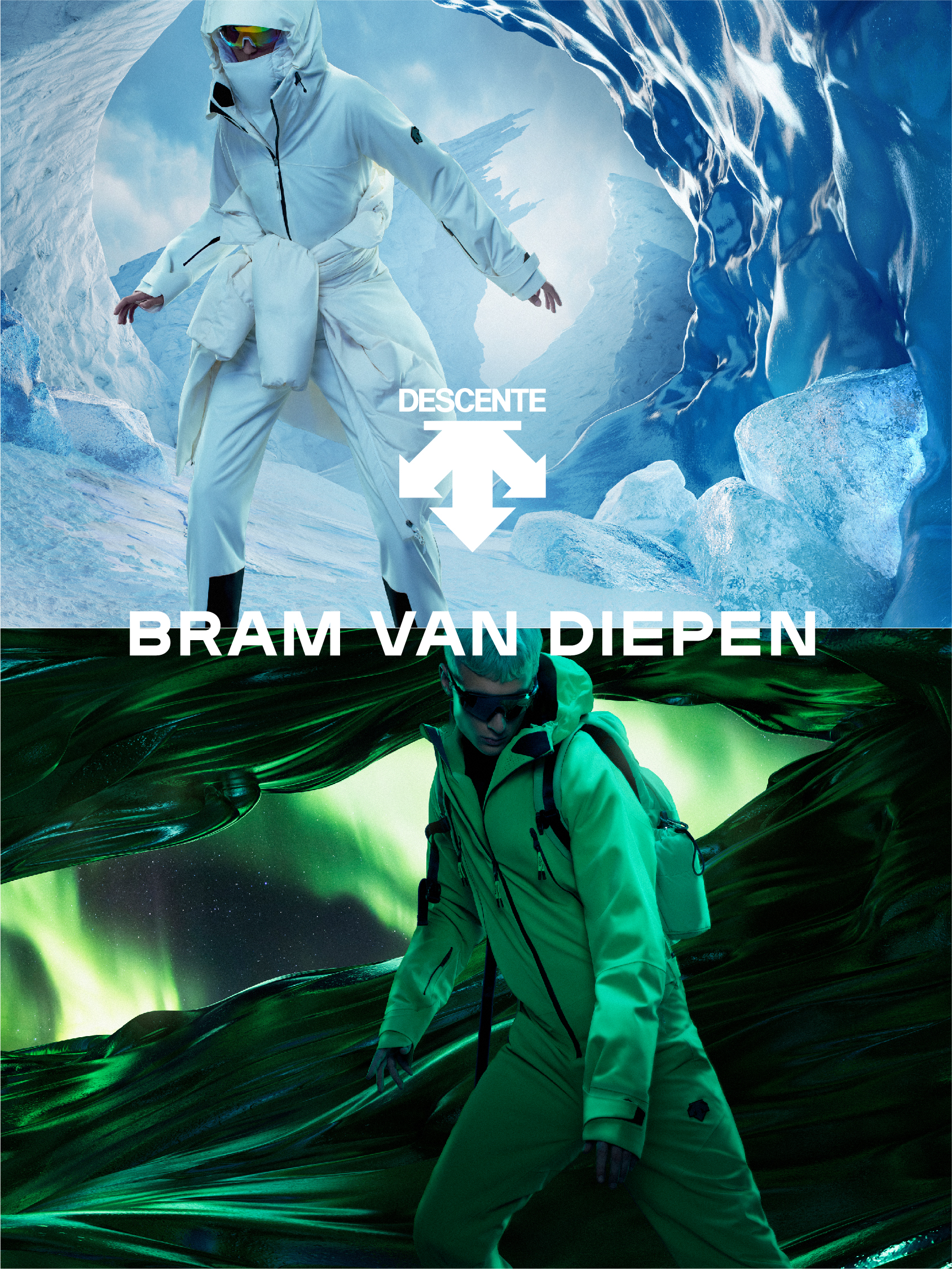 配合这次新品的 Campaign 由加拿大摄影师 Bryan Hyunh 掌镜拍摄,结合 CG 虚拟创作,型录中 Model 示范 DESCENTE 迪桑特 x BRAM VAN DIEPEN 系列,与背景中极光和冰雪的引力场形变场景呼应,配合光影交错的视觉变幻,仿佛置身于超自然感的未来场景,高级时装感与滑雪装备的结合呼之欲出。