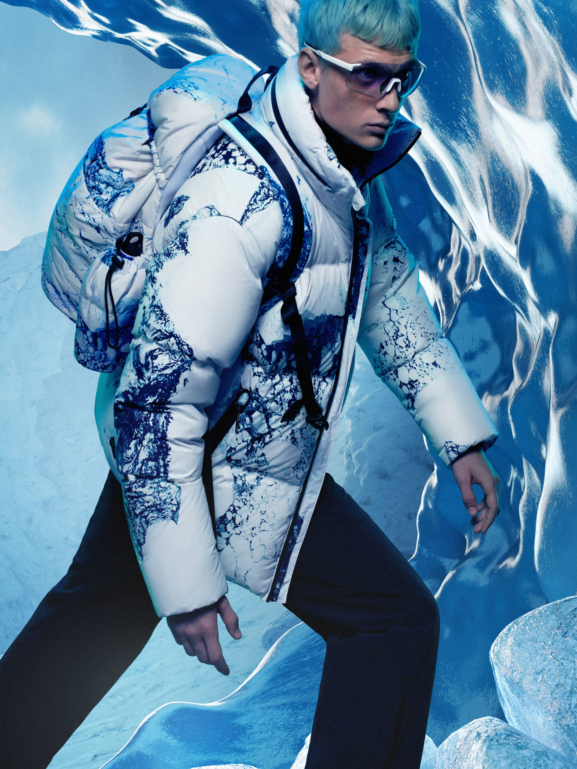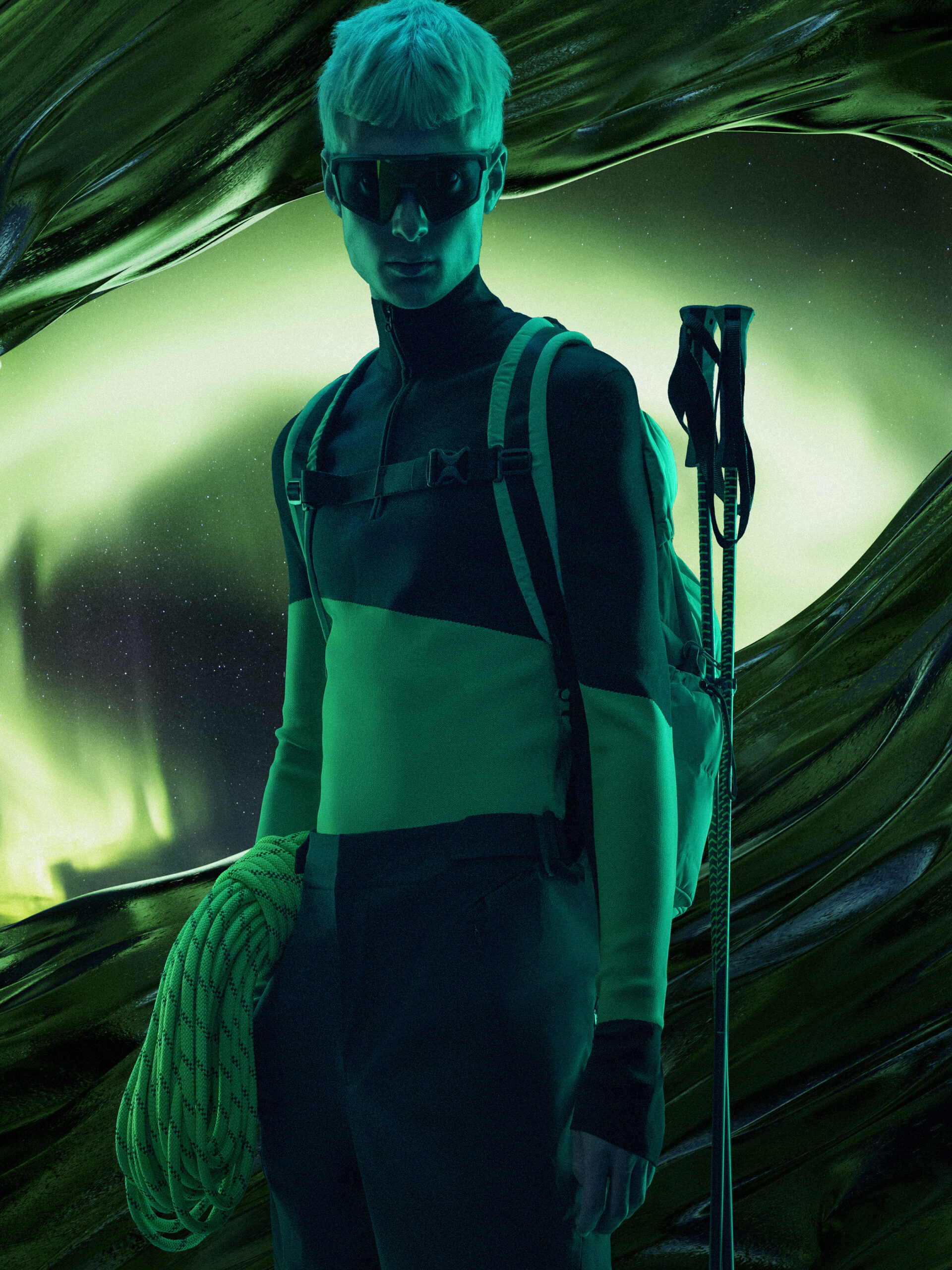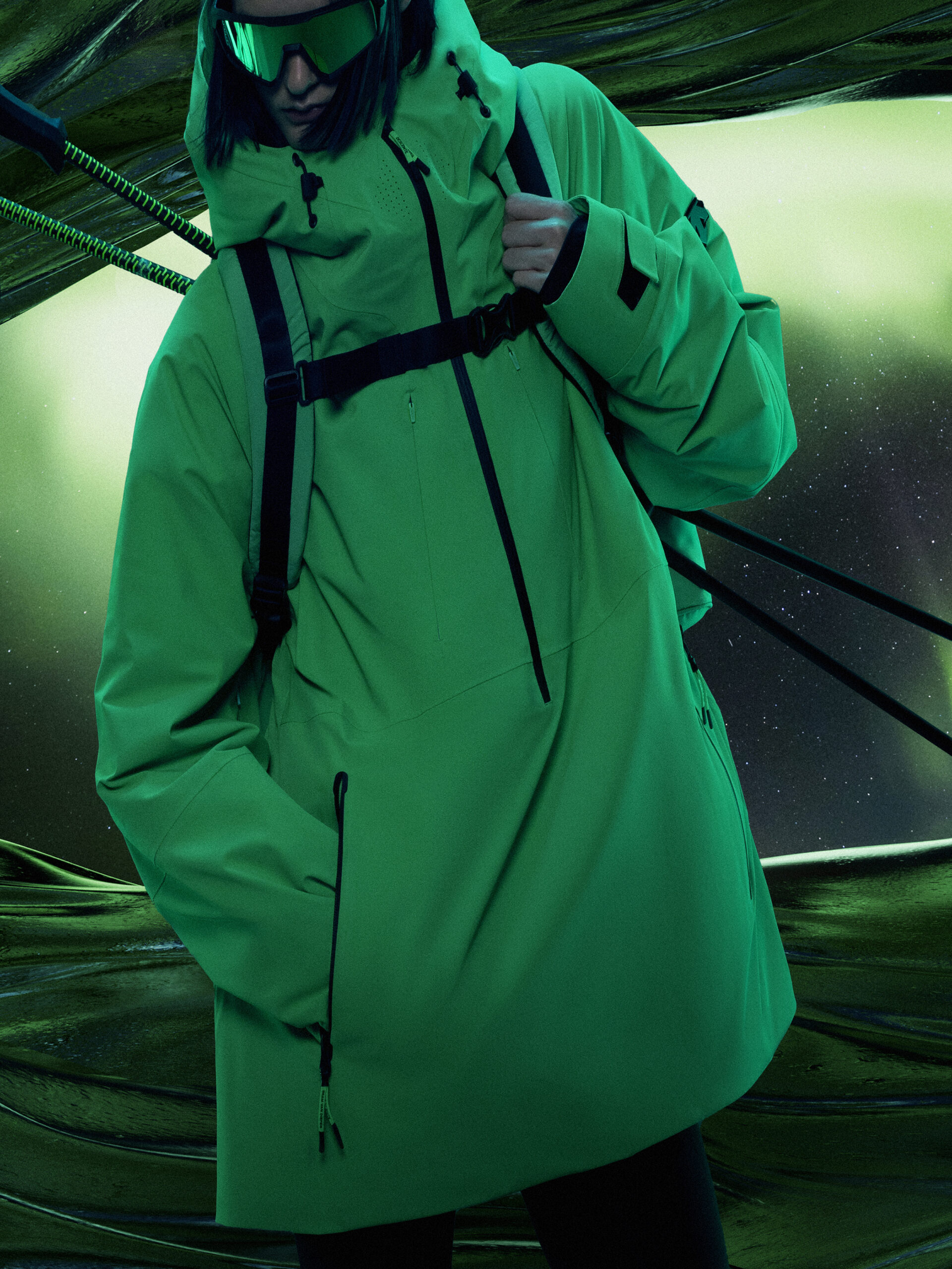 飞驰在白雪皑皑的极地山脉之间,欣赏着幻妙的极光;俯冲滑行,在雪道飞驰,你就是连接雪道与天空的唯一个体…在最纯粹的自然里冲刺,这简直是每个雪友梦想中的完美画面。BRAM VAN DIEPEN 联想到雪者在俯冲滑行或是雪道飞驰中与自然的联结,结合超自然的美丽画面,所以选择极光绿、冰川蓝、极地白为主打色调,结合迪桑特 DNA 中的黑色,超自然美学服装既视感应运而生。