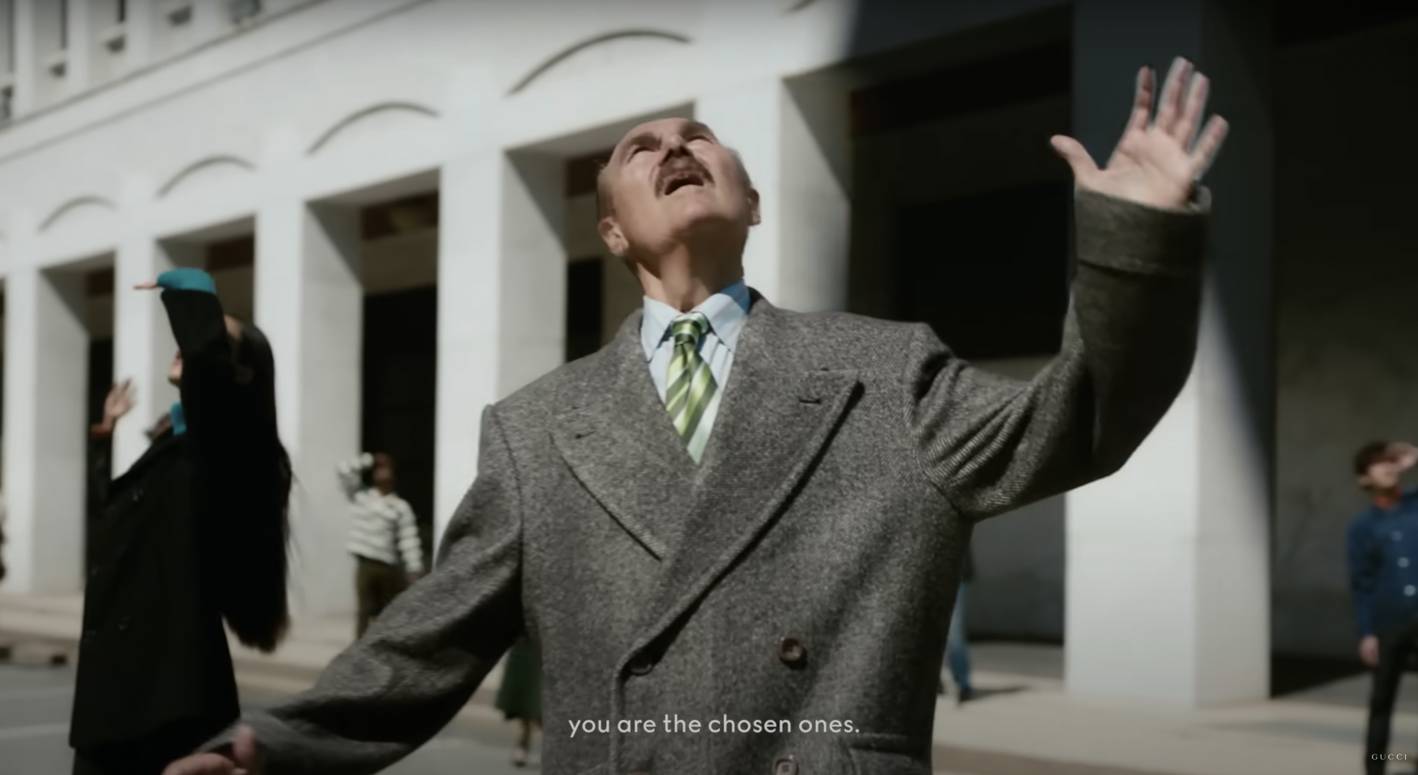 另外当 Alssandro Michele 说出「Palace Gucci.It’s beautiful」台词时,他的意大利口音、语气、声线、动作神态,不禁让人想起马兰·白龙度在电影《教父》饰演的角色;而在 Lev Tanju 面前印有「I AM THE BOSS」杯子,除了点明他的主理人身份外,其实也呼应了《教父》中的台词「You see,I’m not『like a boss』…I AM THE BOSS」。