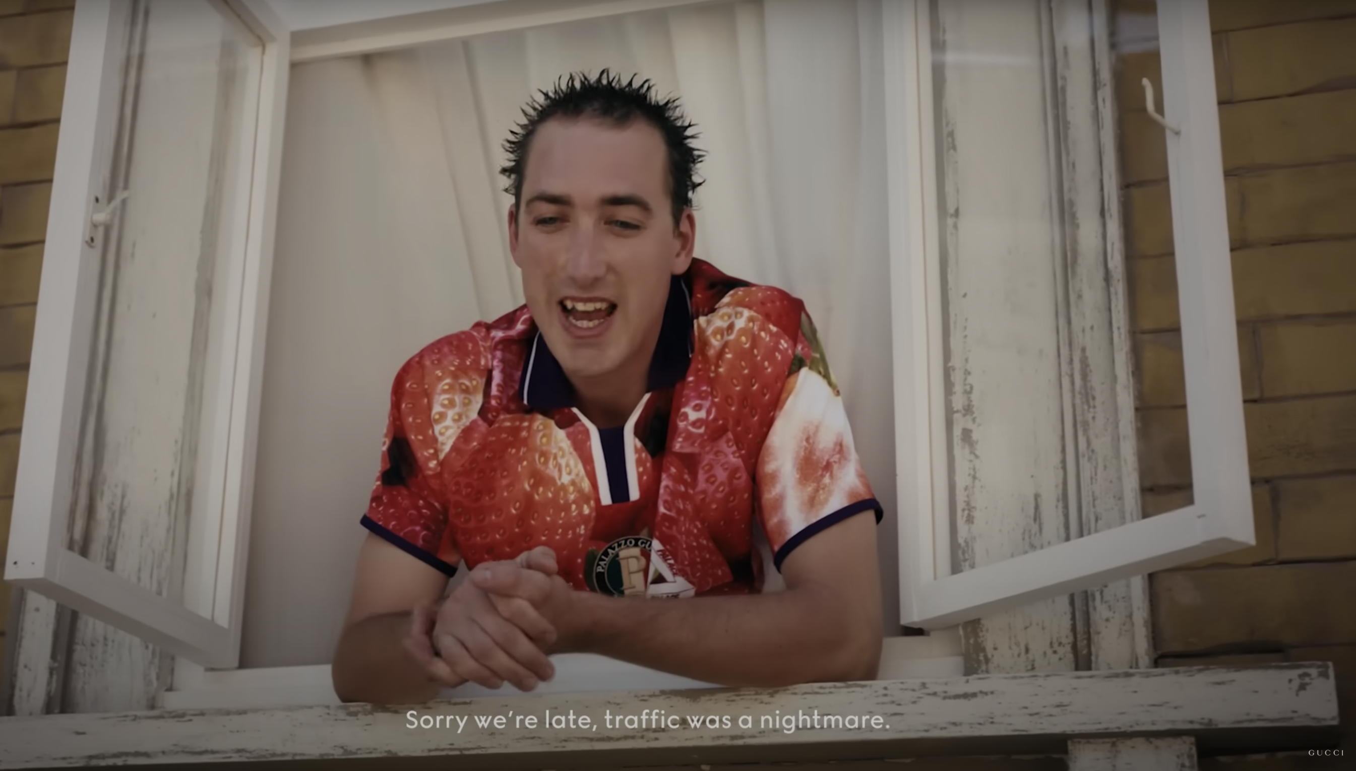 因此不难理解,GUCCI x PALACE Campaign 从台词至画面,为何会「挪用」如此多的经典作品/事件的名场面。准确地说,这场看似来自不同星球的品牌融合,是源自 Alessandro Michele 和 Lev Tanju 对事物/美学进行的「荒诞」处理,这种一致性如品牌在新闻稿表示「(我们在)这个系列中发现的不是分歧而是趋同;一面镜子将两个品牌统一在一个美学表达中的方法、痴迷和意义。」