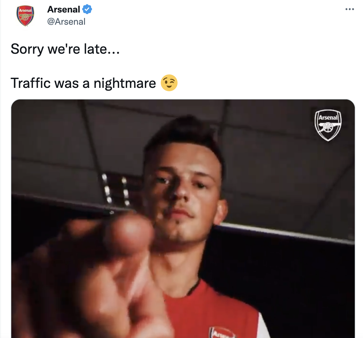 紧接着,一位穿着草莓印花足球衣的通讯员探出头的画面来自动画电影《飞屋环游记》,而后他解释自己迟到的原因「sorry we’re late,traffic was a nightmare」,这句话是取自足球俱乐部 Arsenal 签下球员 Ben White 时官宣的 Twitter 原文。