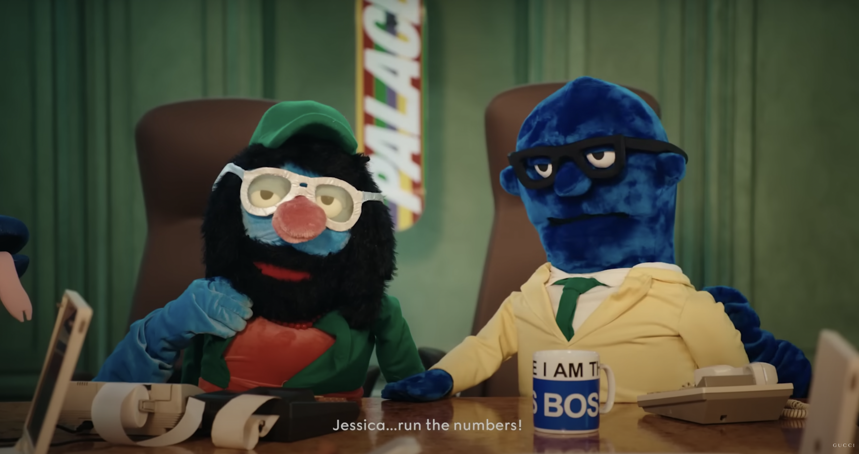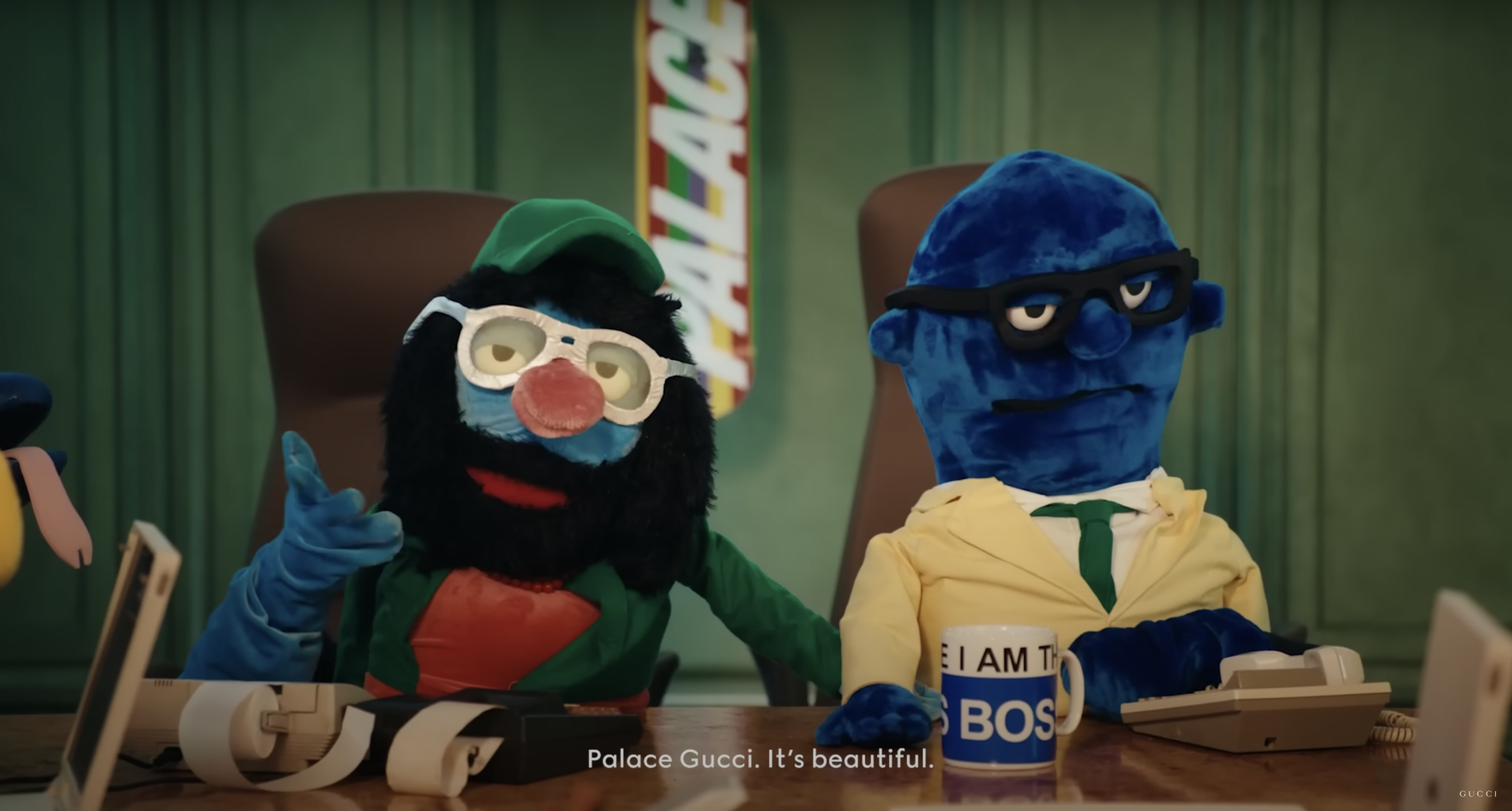 《芝麻街》这里其实充满了巧思,最后的镜头切换到两位戴着眼镜,坐在主位如话事人般的玩偶,其实分别代表了此番合作的核心人物 —— GUCCI 创意总监 Alssandro Michele 和 PALACE 创始人 Lev Tanju。