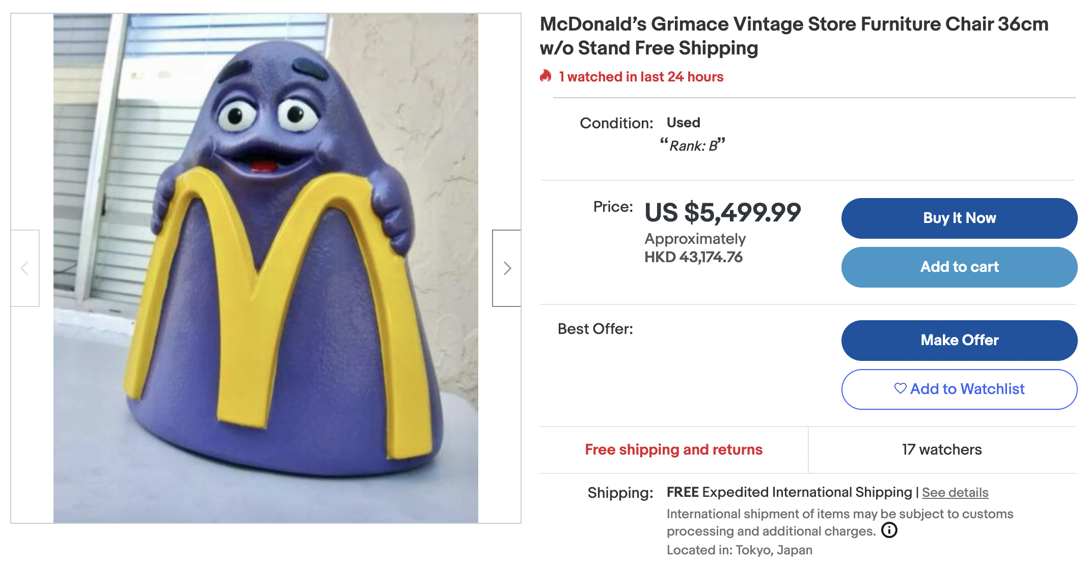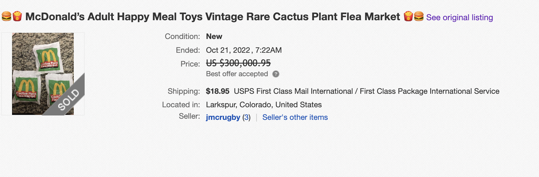而后有位卖家将未拆封的公仔放在 ebay 上,并以 300,000.95 美元高价出售。尽管有媒体称这单买卖只是一个骗局,比如以「0.95」结尾的价格让人感到儿戏,但令人意想不到的是,这件事却引发了「蝴蝶效应」—— 同款的玩具在 ebay 上的售价逐渐升高,从 30 美元到 10,000 美元不等。