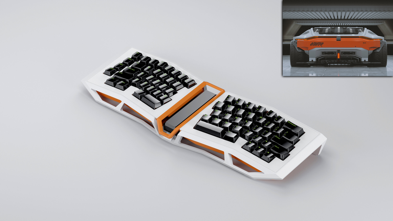 灵感源于好莱坞概念设计大师 Shane Barley 的一款概念超跑「超速 Velocity」,使用电泳工艺叠合白色与橙色,同时纳入现代和复古的概念至一台机械键盘之中,呼应着「幻想机械」的观念,也让概念立体真实地呈现。在创意的光与影之间,与作品交互成先锋的有机形体,在超跑到机械键盘的异化转换,曲线机械的姿态正卯足马力,高速驶向未知的未来。
