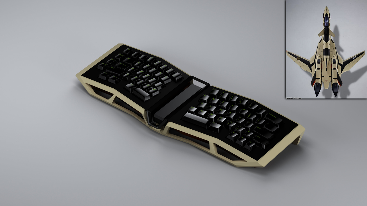 灵感源自于《超时空要塞》剧场版中的 VF-19 Excalibur 全面改造创新成「沙丘要塞」:沙色与黑色电泳的搭配,巧妙地还原了战机的雄奇刚硬的气场和线条感。未来空间之中叠合着年轻视角,机械键盘的悬浮与降落的形态,将作品驶向探索和冒险的未来拓荒的幻想,在光与影的冷峻工业感中,彰显出超现实和先锋创想。