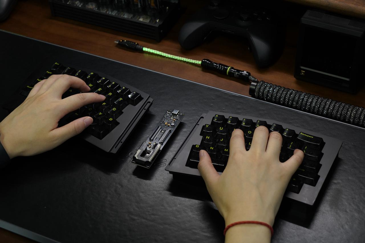 创新的分离式设计,在左右可独立使用的键盘中,内装 PCB、定位版、可调 gas、轴下垫和消音棉集成,最大化地消除了空腔音,带来纯粹的打字音。「可玩性」重新,Angry Miao 首次采用手机行业的四层 PCB 设计,解决了内部空间的拥挤;键盘内置以「超时空航法」与「IN SPACE」为灵感的绿色和红色轴底灯效,用户可定制调节喜欢的 RGB 效果,凸显出客制化的魅力。在黑暗环境下,键盘底灯投射的灯光效果,似飞机照亮跑道的酷炫效果,也犹如未来飞行器夜航中释放的信号,对着地球和宇宙以灯光呼喊,航向未知的未来。