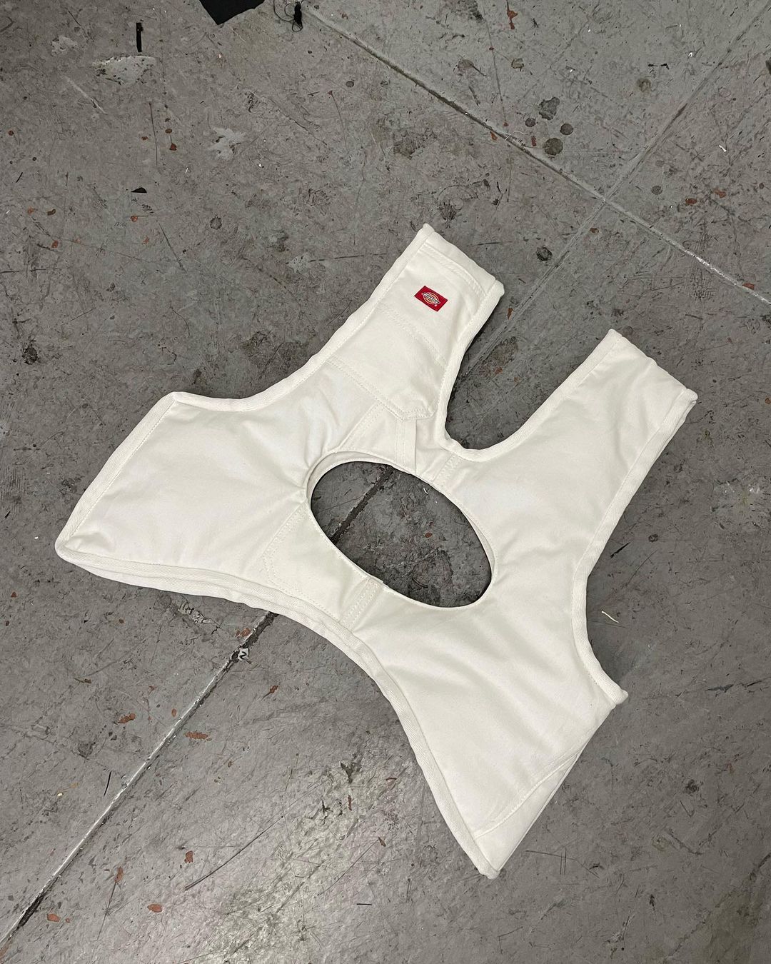 来自于洛杉矶的定制单位 Utopia 一向以改制作品受到关注,这也是为什么此次 品牌会找到其参与 Dickies Blank Canvas 企划的主要原因。创始人 Peder Cho 通过拆解 Dickies 帆布夹克获取布料,通过剪裁和海绵的填充,打造出了这款颇有先锋时尚意味的镂空马甲。