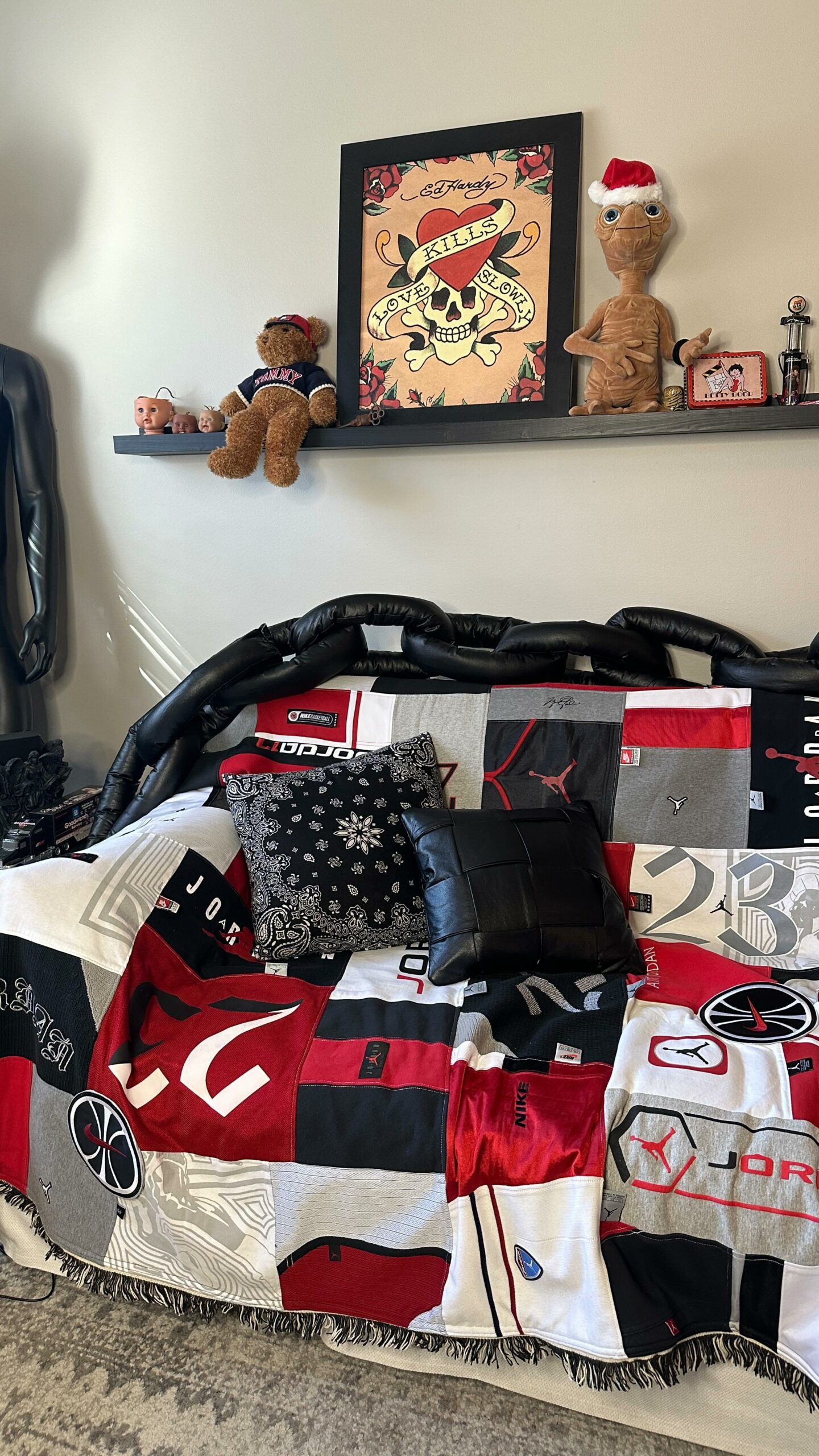将几十件旧 AJ 衣服长裤剪裁拼接制作成一张沙发毯而受到关注的创意人 | Via Instagram @@wandythemaker