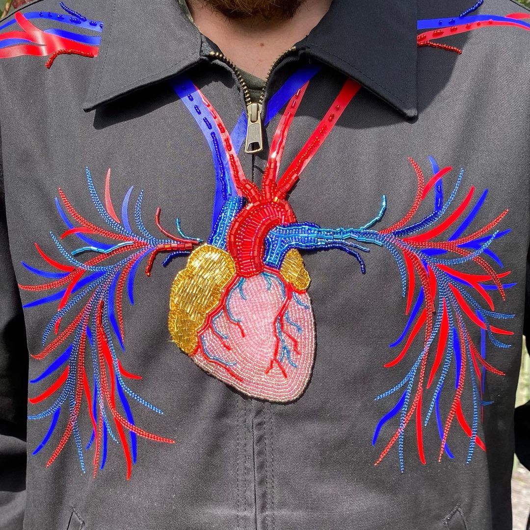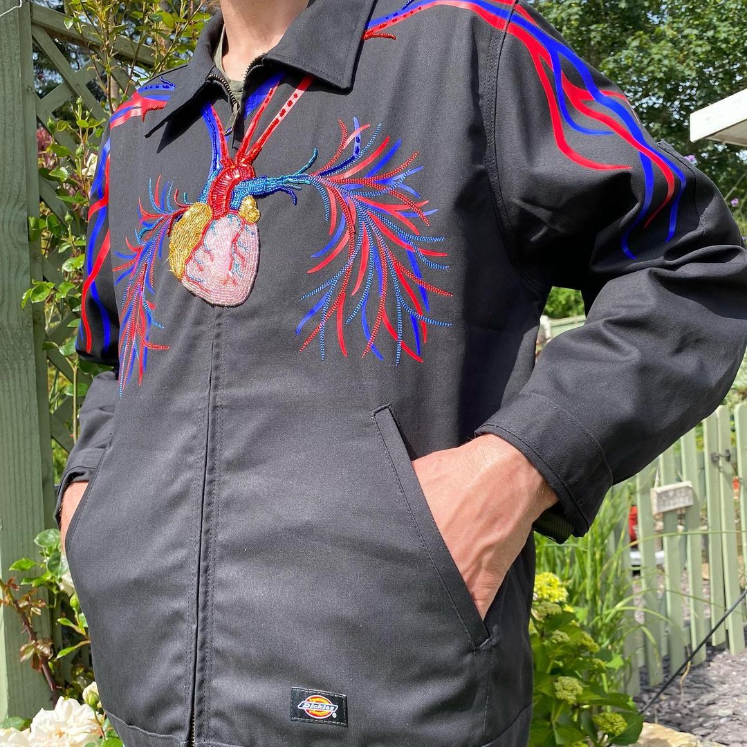 来自英国的艺术家 Amber Griffiths 则擅长刺绣工艺,并且热衷于人体结构与解剖学,因此你能在她过往的作品中看到不少有关于人体器官的艺术创作,而在此次与 Dickies 的合作中也是如此。其再次延续了自己的喜好,将心脏与复杂的血管系统以刺绣的方式呈现在 Eisenhower Jacket 之上,不难看出纯手工打造的工艺颇为精细与复杂。