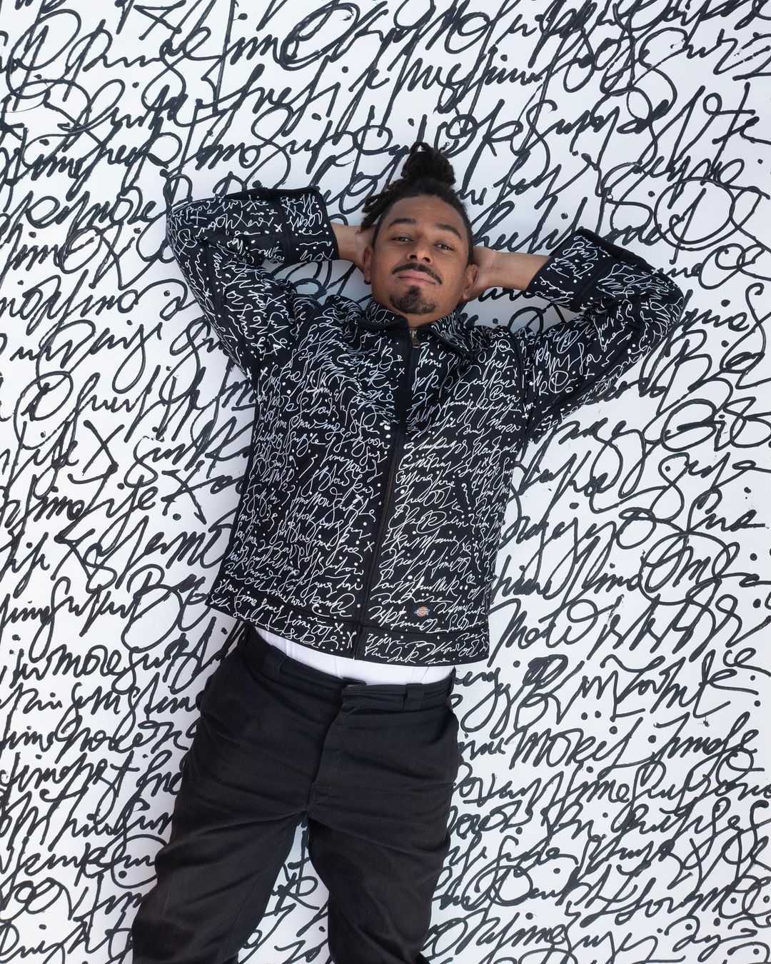 还记得之前那个受到 atmos 邀请,将几十件旧 AJ 衣服长裤剪裁拼接制作成一张沙发毯的创意人 @wandythemaker 吗?他也同样是参与 Dickies Blank Canvas 企划的一员。同样是熟悉的 Patchwork 设计,这一次他将自己娴熟的拼接手法,通过不同颜色、纹路的布料融合泼墨、丝网印刷等方式应用在了 874 工装裤上。