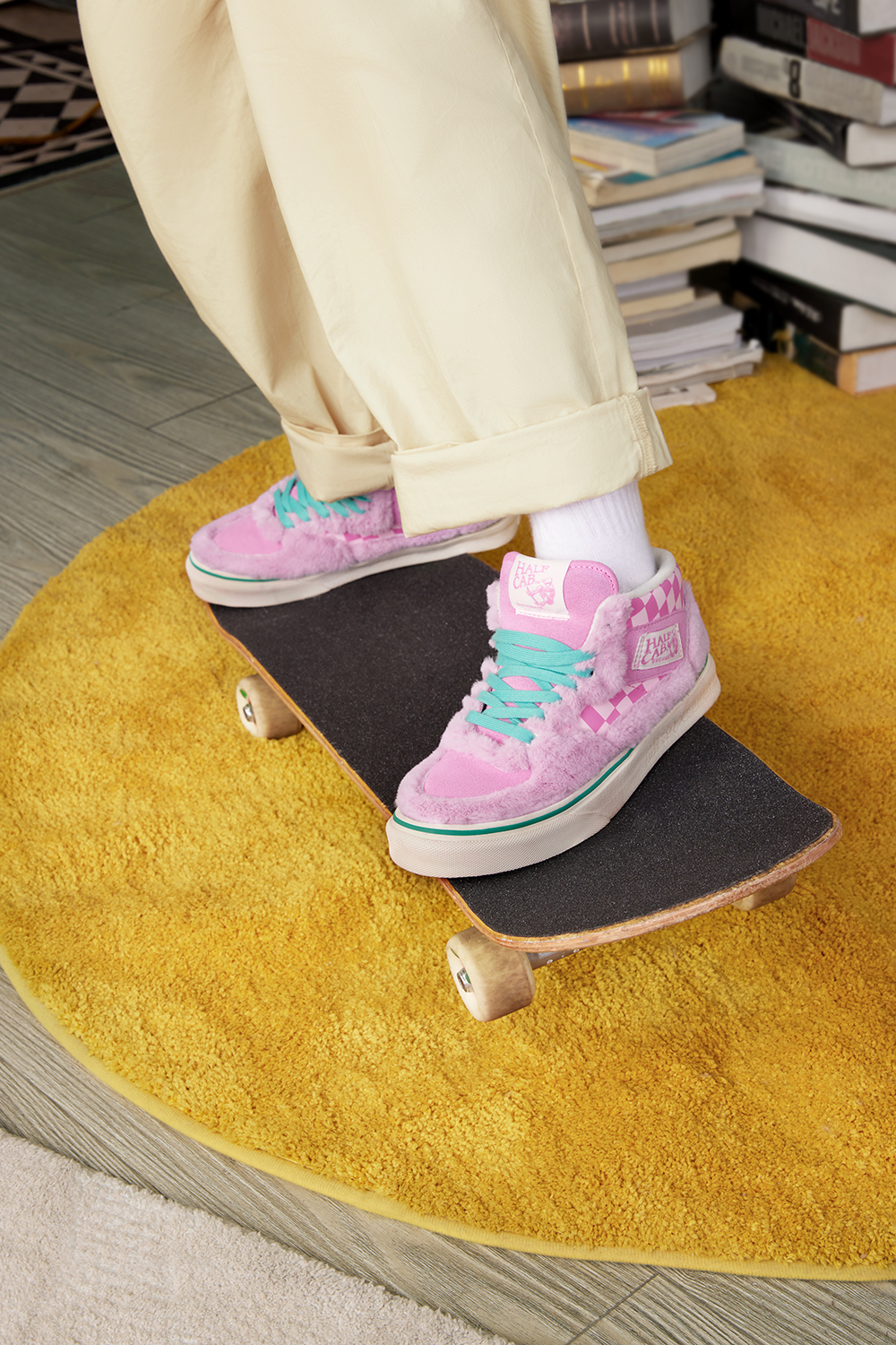 Half Cab 鞋身整体以粉色长绒毛搭配粉白色棋盘格呈现,很容易便能联想起「兔子」的形象。Style36 围绕墨绿色展开设计,鞋腰处点缀绿白色棋盘格,延续复古韵味。Authentic 水蓝色鞋面搭配粉色细节,同时饰有「幸运萝卜」主题印花。Sk8-Hi 则在皮革材质鞋身暗藏棋盘格元素,橙色注入侧边条纹和鞋带,以相对街头化的氛围打造。