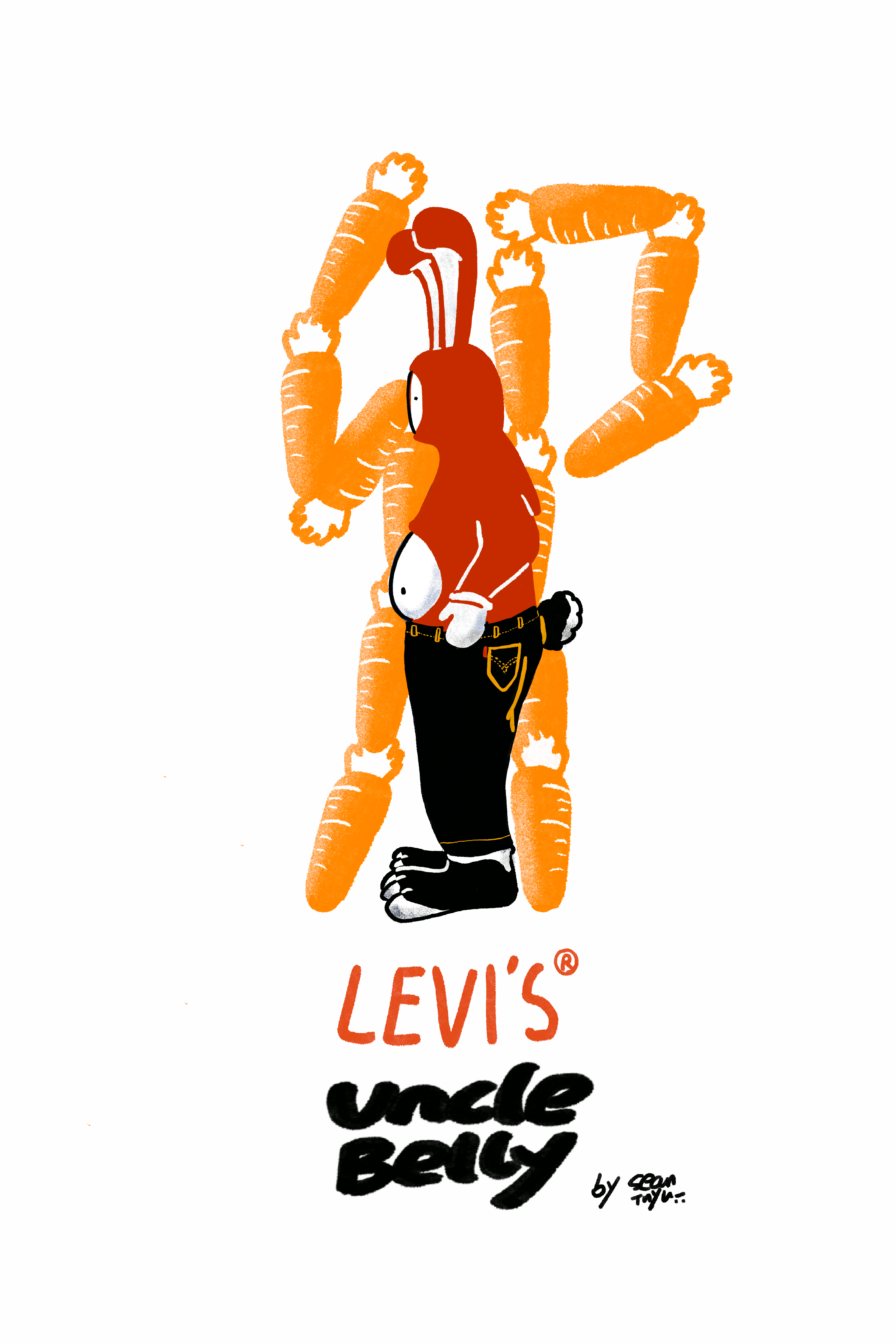 Sean 沈天宇笔下一向不被年龄和外表束缚的 Uncle Belly,这回就穿上了兔子装和 Levi’s® 牛仔裤,用胡萝卜表达在他眼中这样过年完全卯问题的「新青年」态度;AGAHO 用简洁的线条便勾勒出一副诙谐轻松的「兔」式生活图景。Levi’s® 标志性 Logo 化作新春灯笼和兔形字母,传统元素碰撞鬼马画风中,代表传统春节的红黄色彩在其中也显得格外生动趣味……