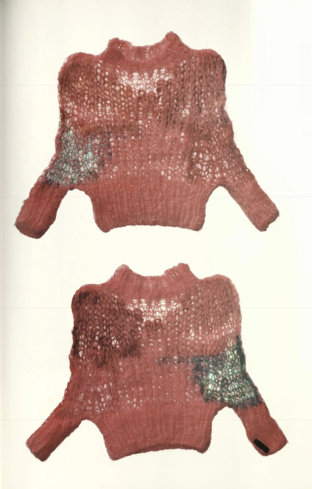 几乎所有标榜着朋克的品牌,都推出过 Mohair Jumper(毛衣),AFFA 也不例外。这件在千禧年初设计的黑白混色马海毛毛衣,其灵感源自 Seditionaries 时期,Vivienne Westwood 为 Sex Pistols 制作的马海毛毛衣;而 2005 年秋冬系列推出的印花 T 恤也不难看出其本体是 Seditionaries 的经典名作 Parachute Shirt;另外出现在《宝岛》杂志「Last Orgy 2」栏目的 MA-1 夹克 —— AFFA 最初发布的单品之一,因为是纯手工制作,每件夹克上标语、Logo 等元素的具体呈现有着细微的变化,但整体外观与 Seditionaries 时期的 Anarchy 衬衫非常相似,其中一些标语图案甚至是来自这件衬衫的某一部分。