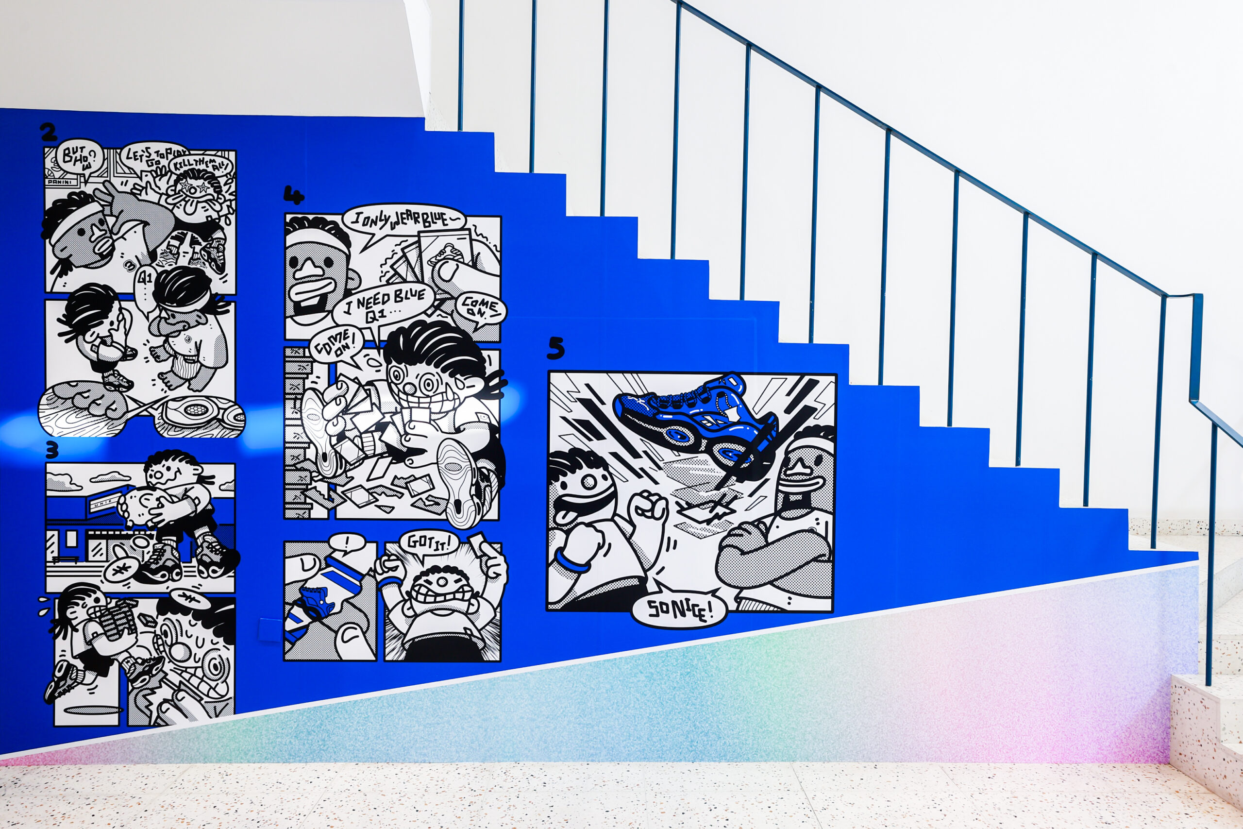 入口处的镭射元素高调显眼,随处可见的篮球漫画与涂鸦元素、产品细节海报与漫画分页印刷物,融合进一个天马行空的炫彩街球场的场景设定,既强调联名双方的属性,又带给所有到访的篮球爱好者们一个多元且沉浸的美好体验。