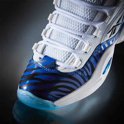 Question Mid「Tiger Prizm」鞋款,配色采用了 Panini America 经典火爆的「Tiger Prizm」平行卡色,拼接鞋头上的蓝底色呈现出的斑马纹案是艾弗森永不服输的精神象征。