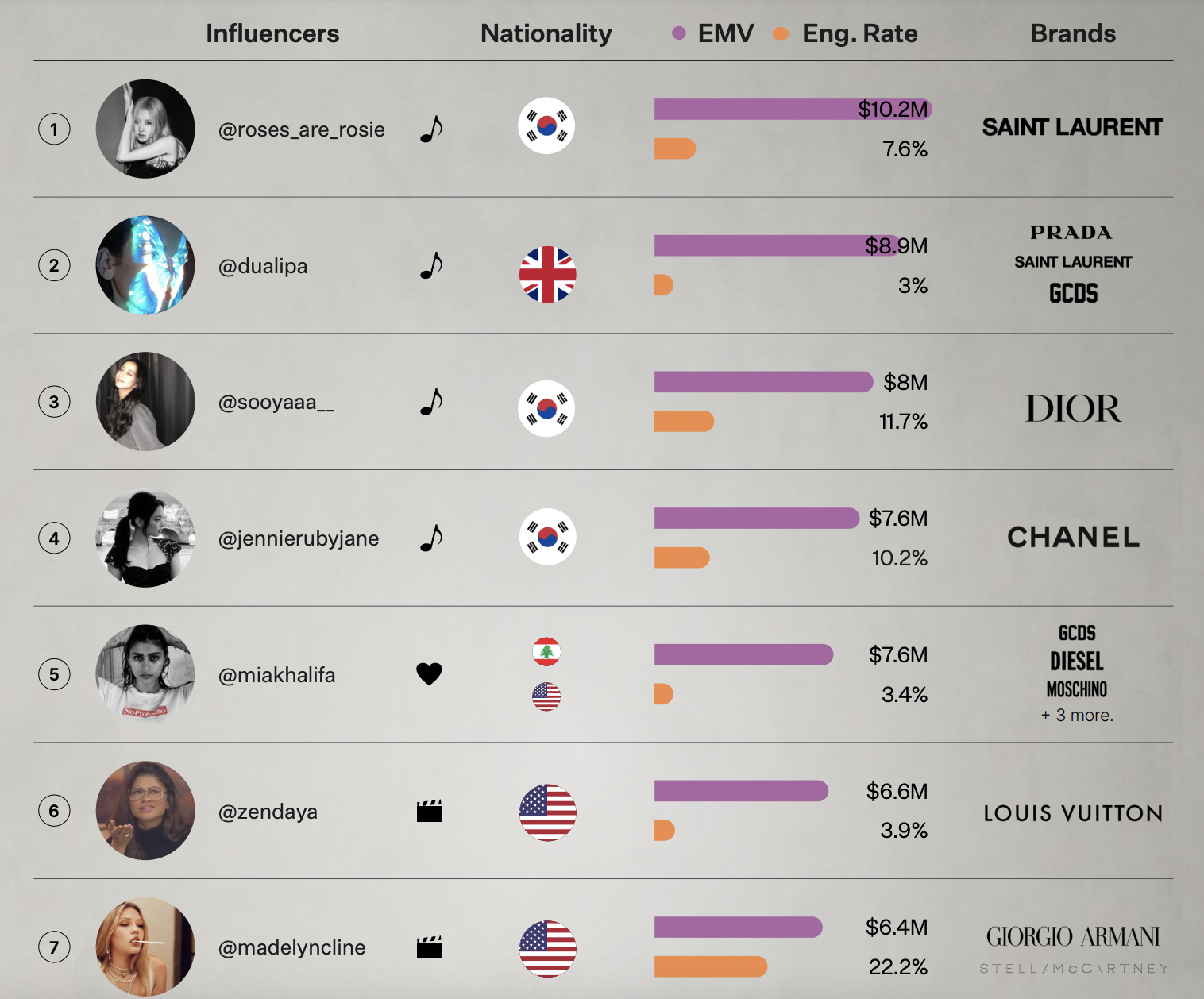 而成员 Rosé 更是同时与开云集团的 Saint Laurent 和 LVMH 集团的 Tiffany & Co. 合作,这位爱豆前段时间现身 Saint Laurent 2023 秋冬秀场,其性感内搭与褐色皮革长大衣的造型引起话题。据时尚机构 Karla Otto 联合营销咨询公司 Lefty 释出的报告显示:Rosé 在 2023 秋冬时装周中赢得最高媒体价值(EMV),而 Saint Laurent 也依靠 Rosé 和 Dua Lipa 等名人在品牌 EMV 排名中荣登榜首;排名第二的是 DIOR,而 DIOR 的代言人 —— BLACKPINK 成员 Jisoo 同样在名人 EMV 排行中位于前列…