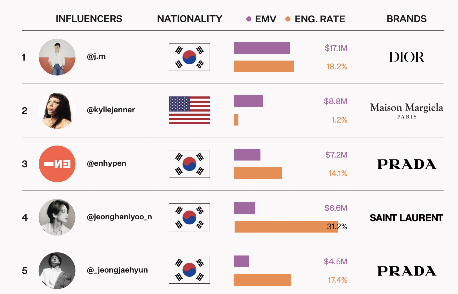 回顾同季度国际男装秀的 EMV 数据,名人 EMV 排行榜的前五名中,韩国艺人就占了其中四个位置。其中被 DIOR 任命为全球品牌大使的 BTS 朴智旻(Jimin)排名第一。截至目前为止,BTS 除了是 LOUIS VUITTON 的全球品牌大使外,如开篇所言,像金南俊、田柾国等成员也手握其他时尚大牌的资源。