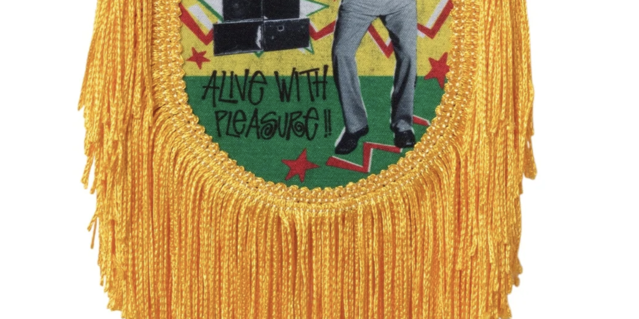 再仔细看,挂饰上出现「ALIVE WITH PLEASURE!」标语,如上文提到,这句标语出自以前的 Rave 传单,「快乐生活,活在当下」的生活态度完全符合由电子舞曲、雷鬼衍生的亚文化或俱乐部精神,同时也是 Martine Rose 在设计中常涉及到的主题。